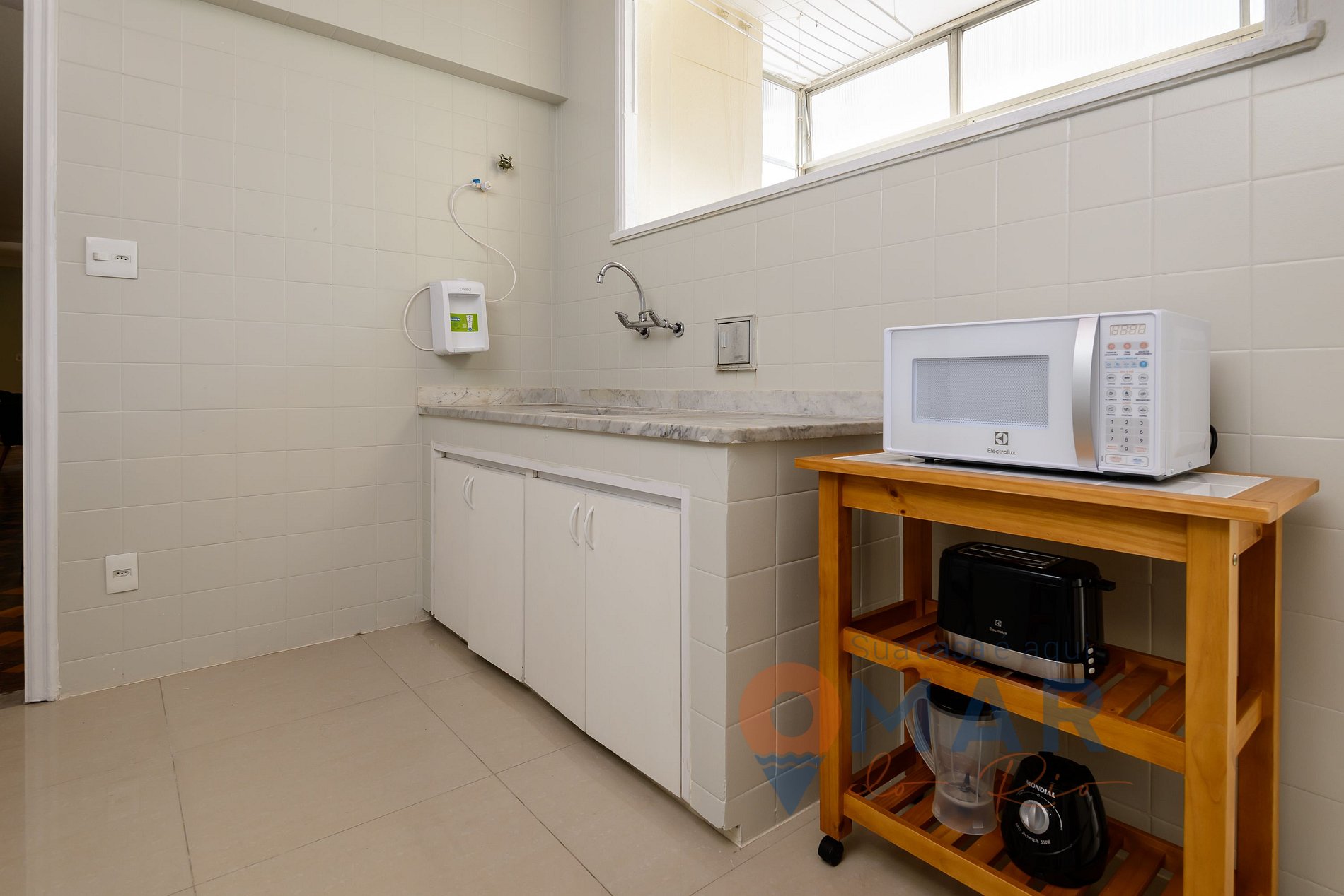 Cozinha: Geladeira, fogão 4 bocas com forno, cafeteira elétrica, cafeteira expresso, liquidificador, torradeira, micro-ondas, taças, purificador de água natural e utensílios de cozinha.