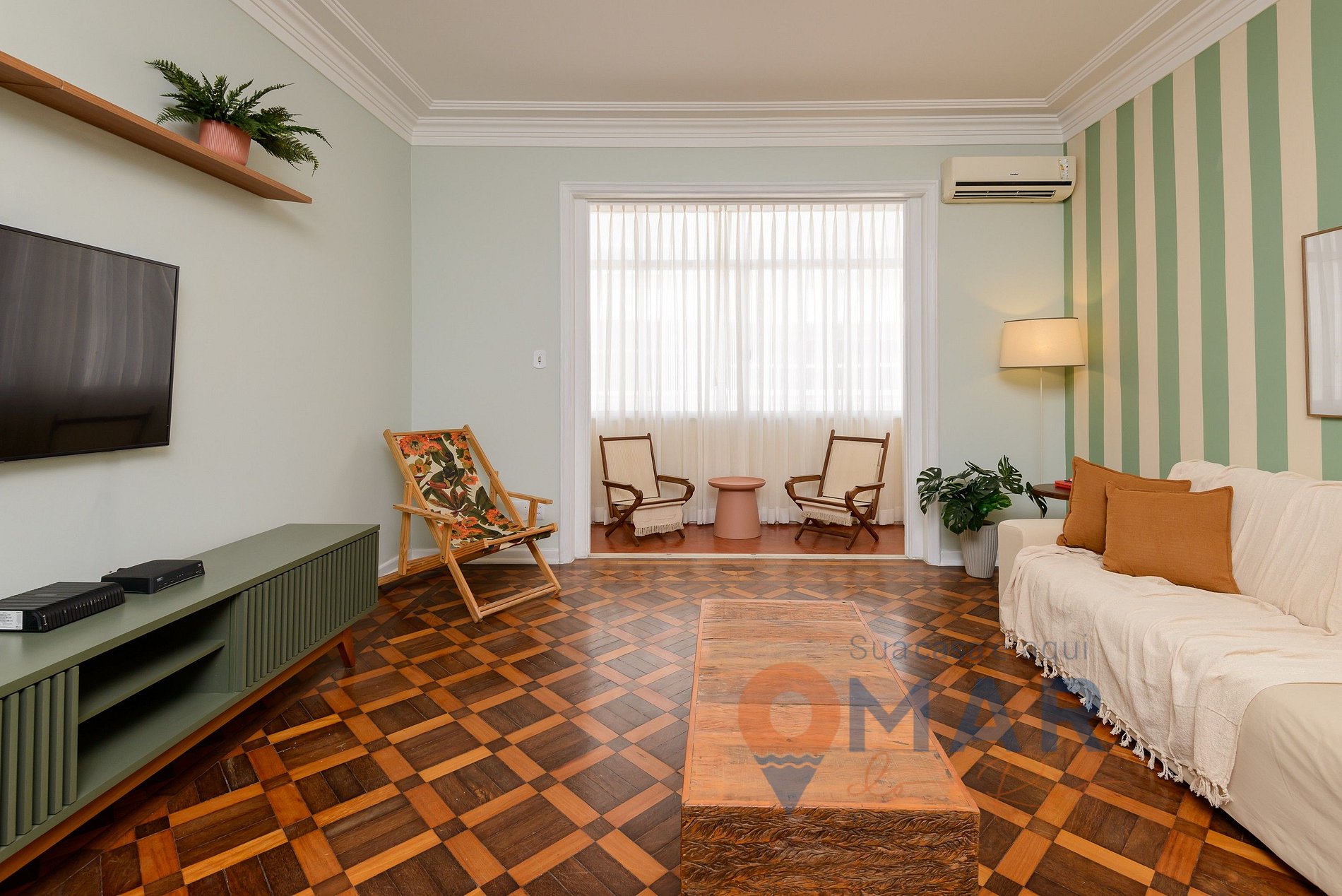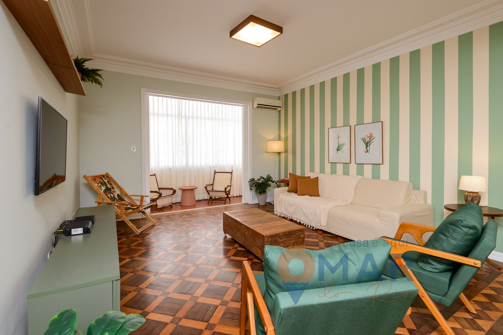 Sala de TV: Sofá, Smart TV 50'', itens decorativos, ar-condicionado split, espelho, mesa de centro e poltronas.