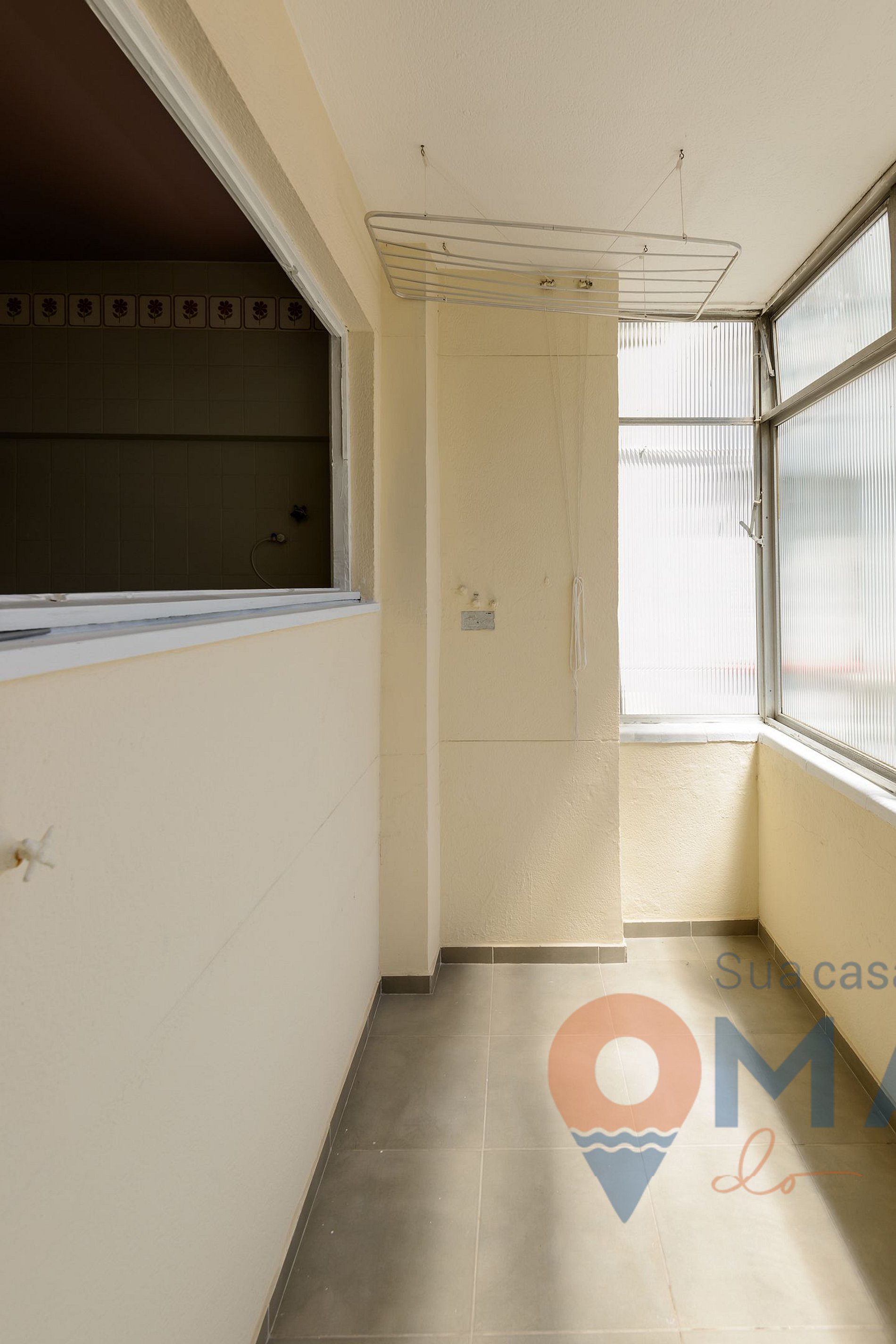 Varanda interna: Cadeiras, mesinha e cortina translúcida.