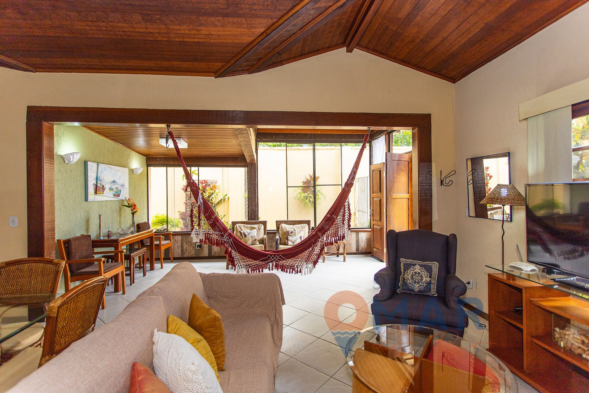 Sala de Estar e Jantar (1º andar): sofá, poltronas, TV 43" com TV Box, ventilador de teto, rede de descanso, cortinas translúcidas, mesa de jantar com 6 assentos e espelho.