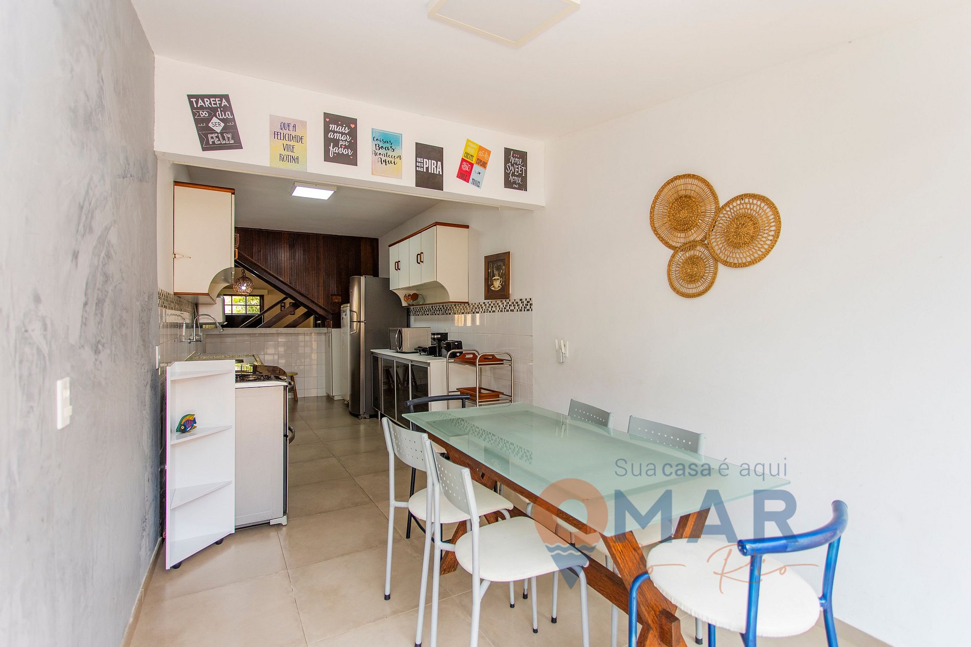Cozinha (1º andar): geladeira, freezer, fogão 5 bocas com forno, micro-ondas, forno elétrico, cafeteira elétrica dose individual, sanduicheira, torradeira, liquidificador, purificador de água com água natural, fria e gelada, mesa de jantar com 6 assentos e utensílios para cozinhar.