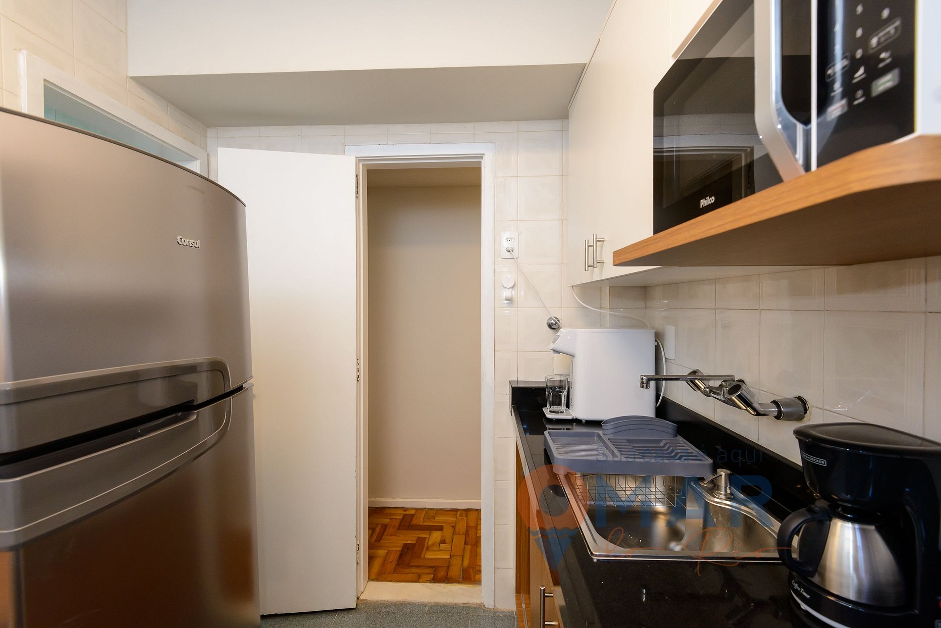Cozinha: geladeira, fogão 4 bocas com forno, micro-ondas, air fryer, cafeteira elétrica, purificador de água com água natural, fria e gelada, liquidificador, sanduicheira, chaleira e utensílios para cozinhar.