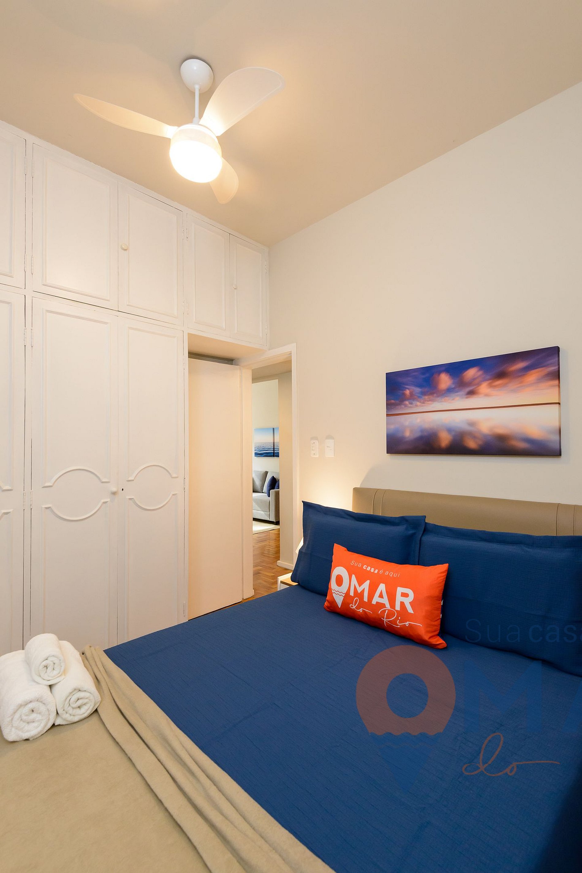Quarto 2 - No meio do corredor: cama casal (188cm x 138cm), ar-condicionado, ventilador de teto, guarda-roupas com cabides, persiana blackout e espelho de corpo inteiro.