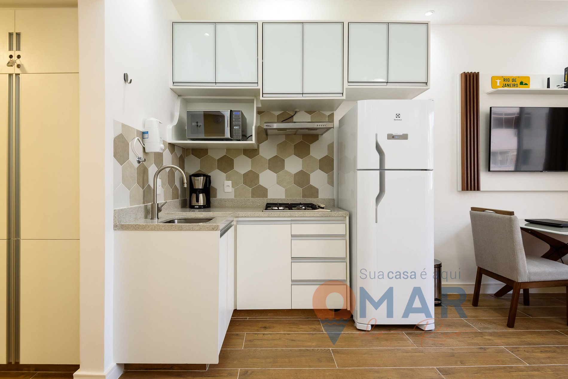 Cozinha: Microondas, fogão cooktop, cafeteira, geladeira e itens de cozinha.