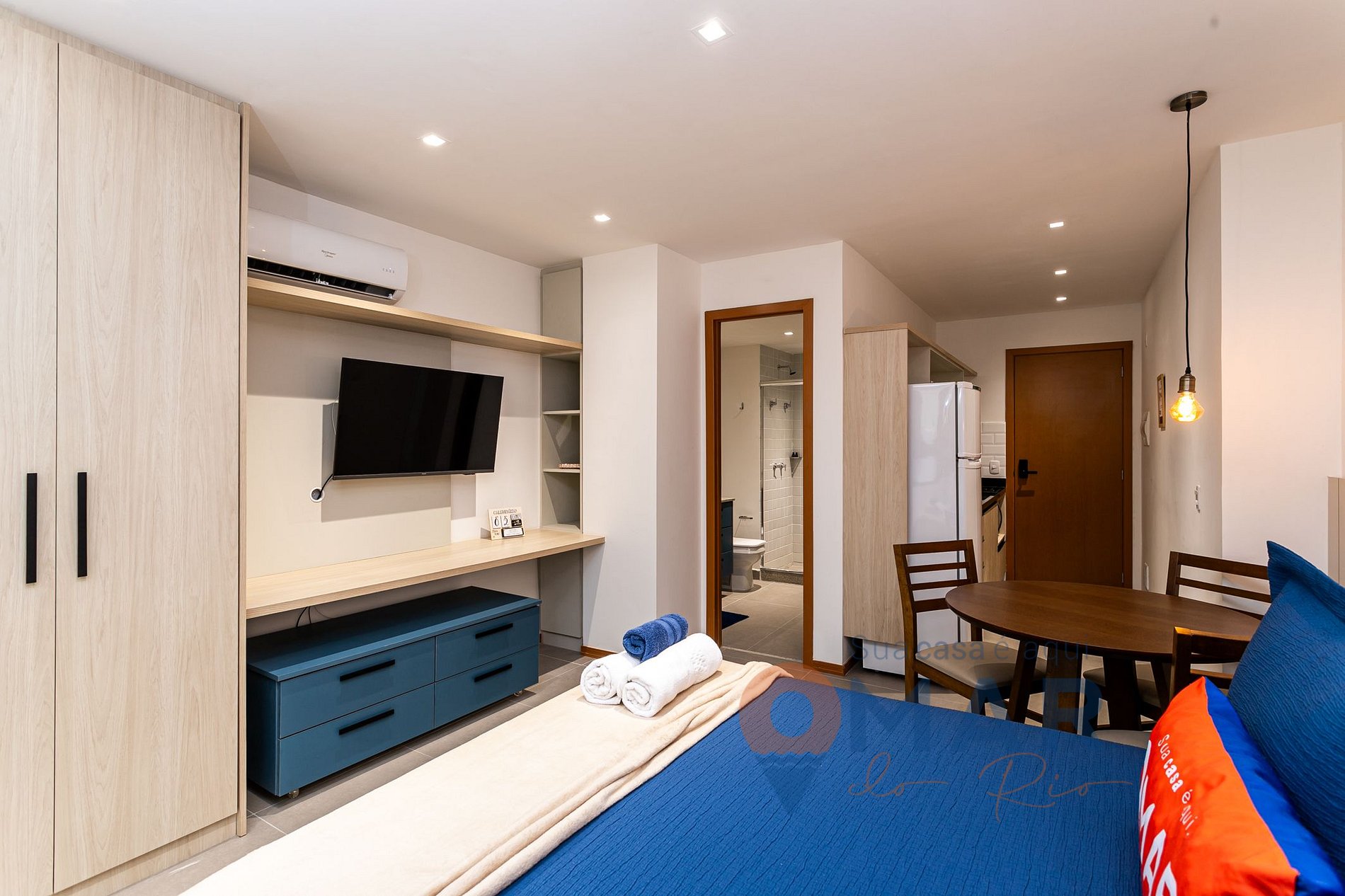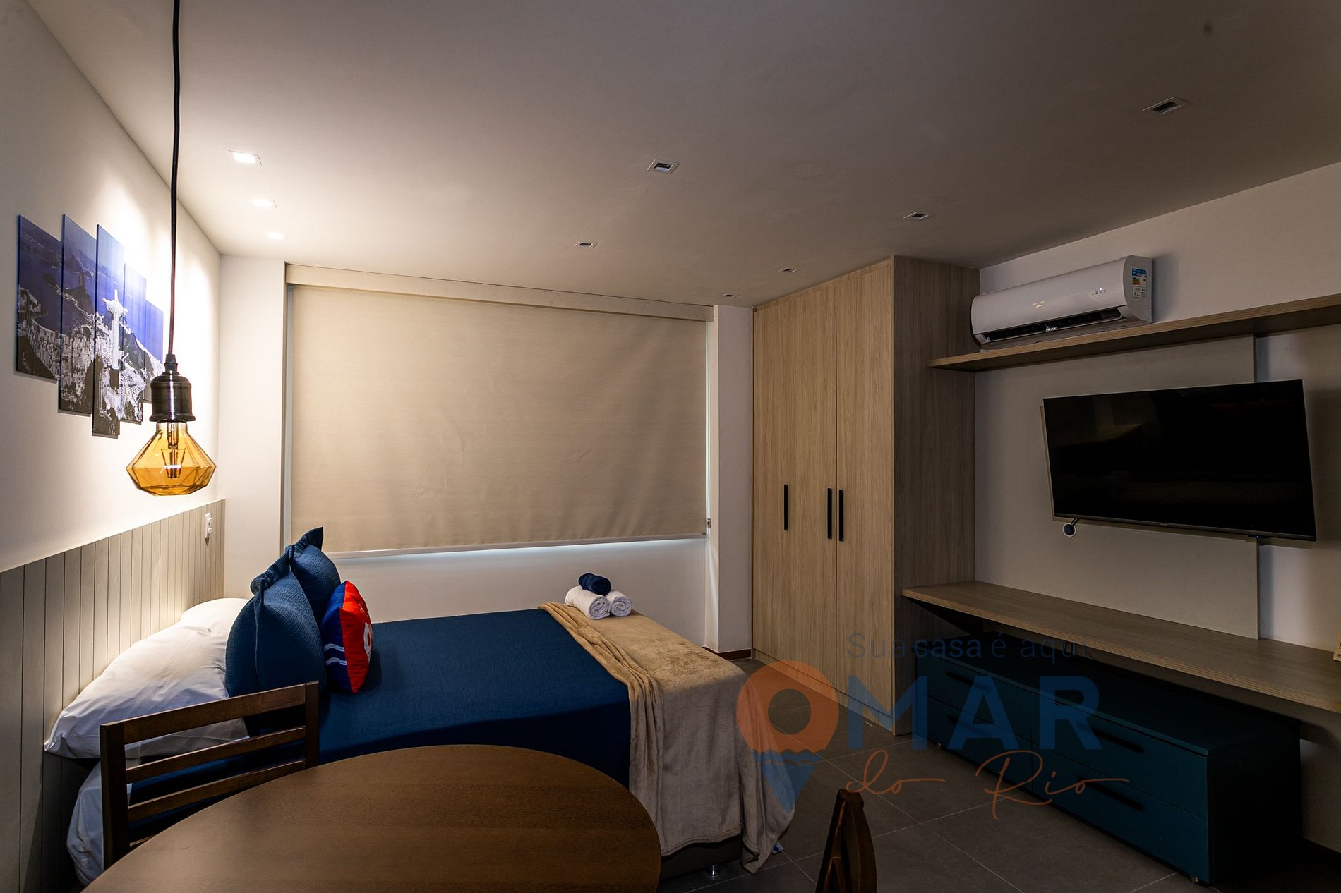 Estúdio: cama Casal padrão (188cm x 138cm), ar condicionado, Smart TV com canais a cabo, mesa de jantar + assentos, armário fechado, cabides e cortina blackout.