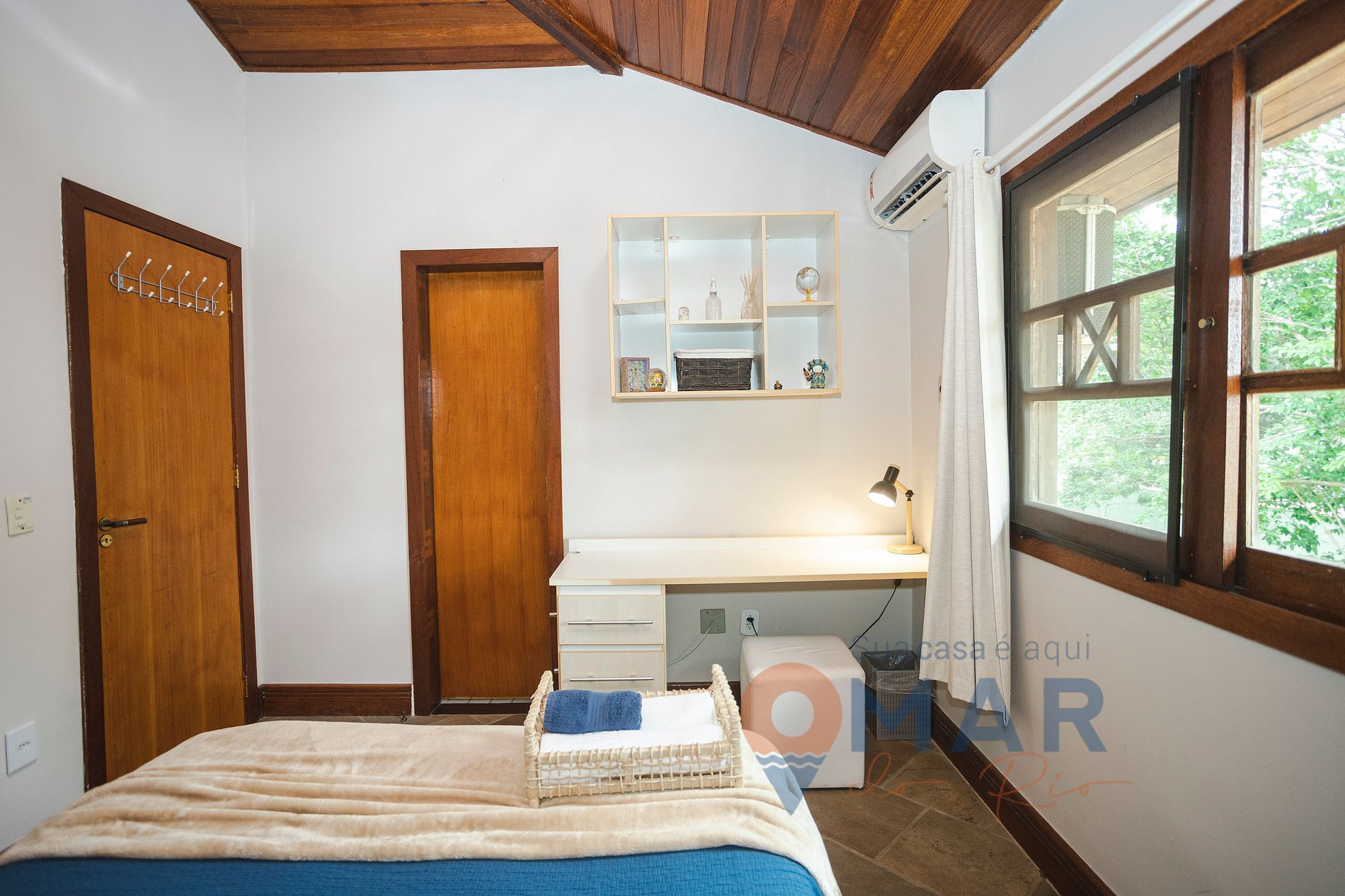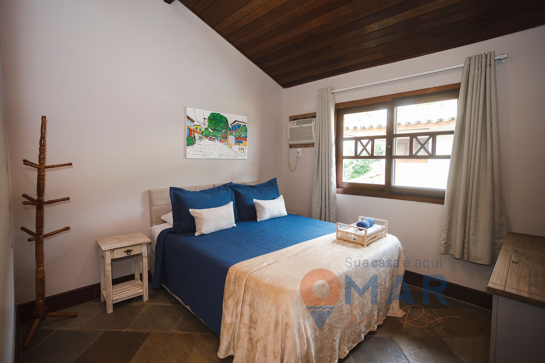 Suíte 3 (2º andar): Cama casal padrão (188cm x 138cm), televisão com canais básicos, ar-condicionado split, ventilador de teto, armário e cortina blackout.