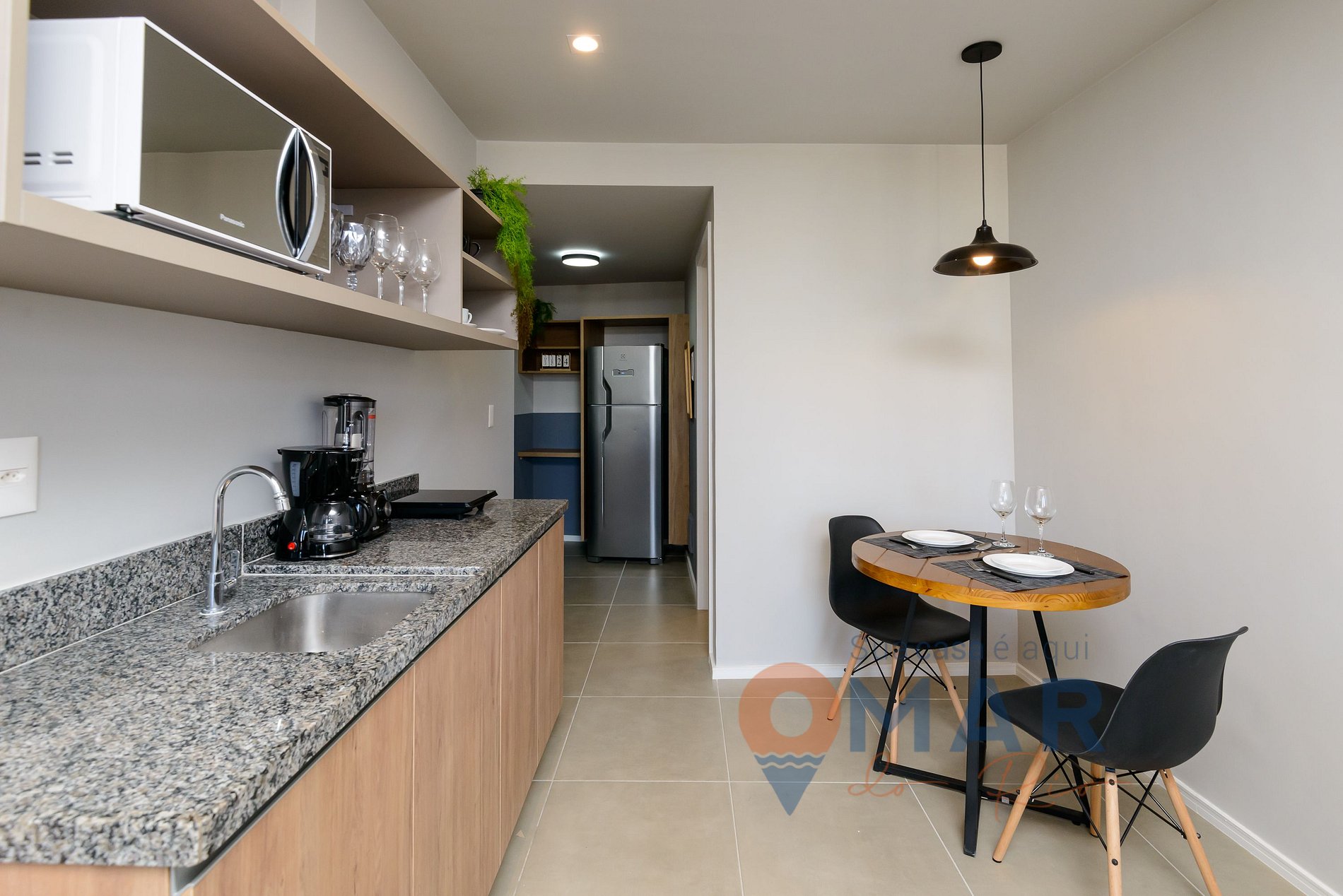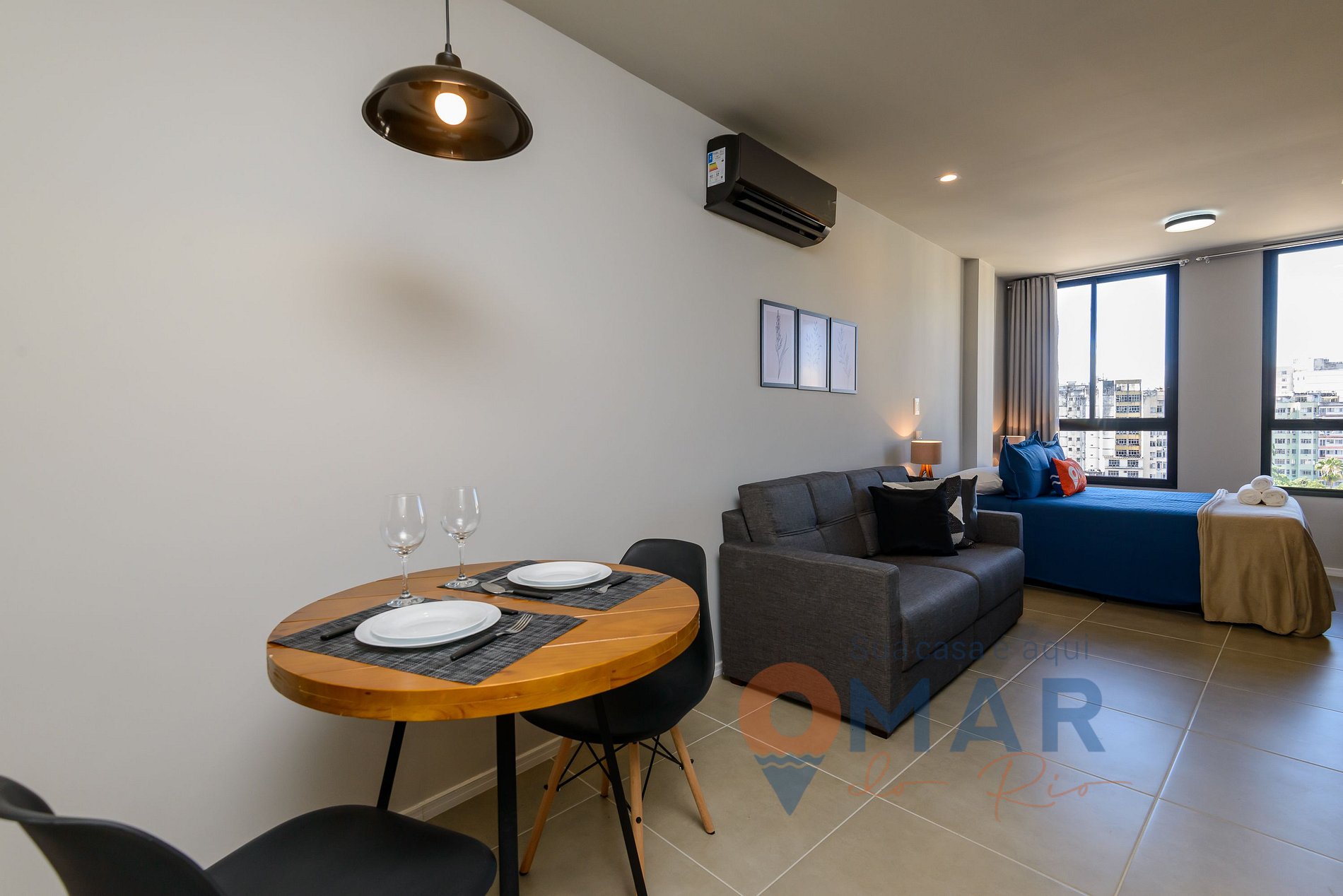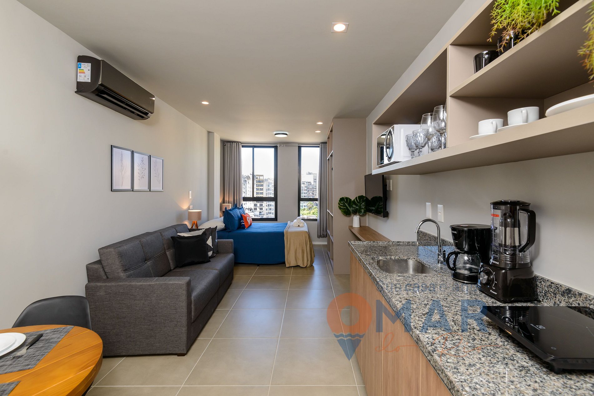 Estúdio: cama casal (188cm x 138cm), sofá, smart TV 43", ar-condicionado split, cortina blackout, armário com cabides e mesa de jantar com assentos.