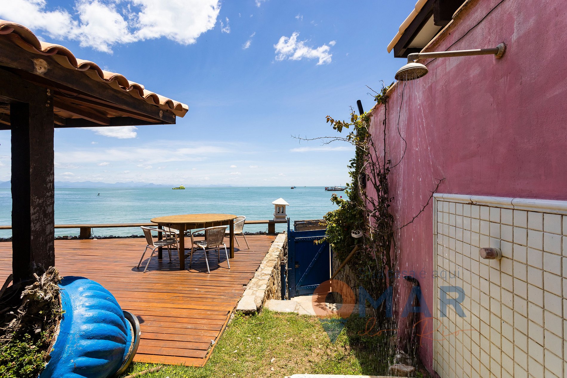 Varanda Beira-Mar: sofás, banco para descanso, mesa com 4 assentos e chuveirão.