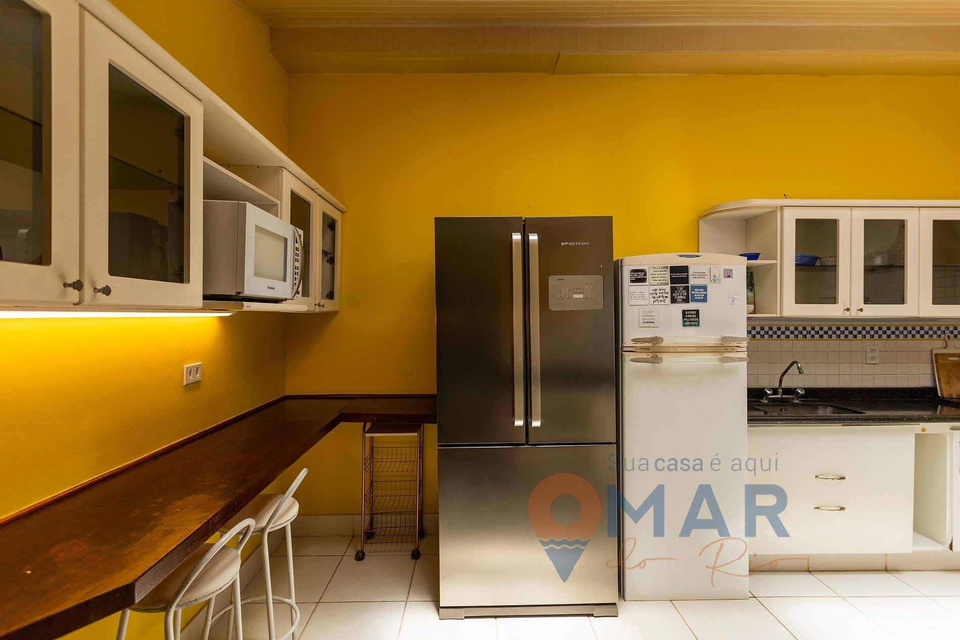 Cozinha: 2 geladeiras, fogão cooktop 5 bocas, micro-ondas, cafeteira Nespresso, liquidificador, purificador de água com água natural e gelada, sanduicheira, máquina de gelo, bancada com 2 banquetas e utensílios para cozinhar.
