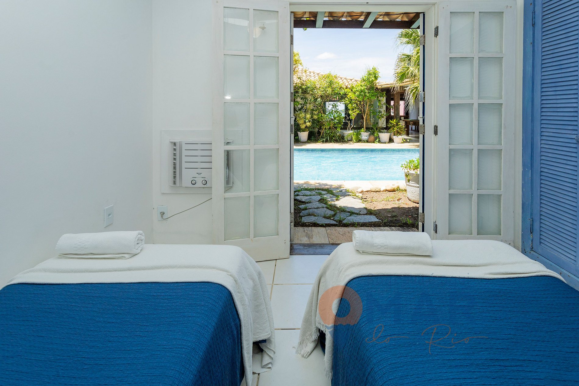 Quarto Solteiro - Saída para a Piscina: 2 camas de solteiro (187cmx88cm), ar-condicionado, ventilador de teto, guarda-roupa com cabides e espelho de corpo inteiro.
