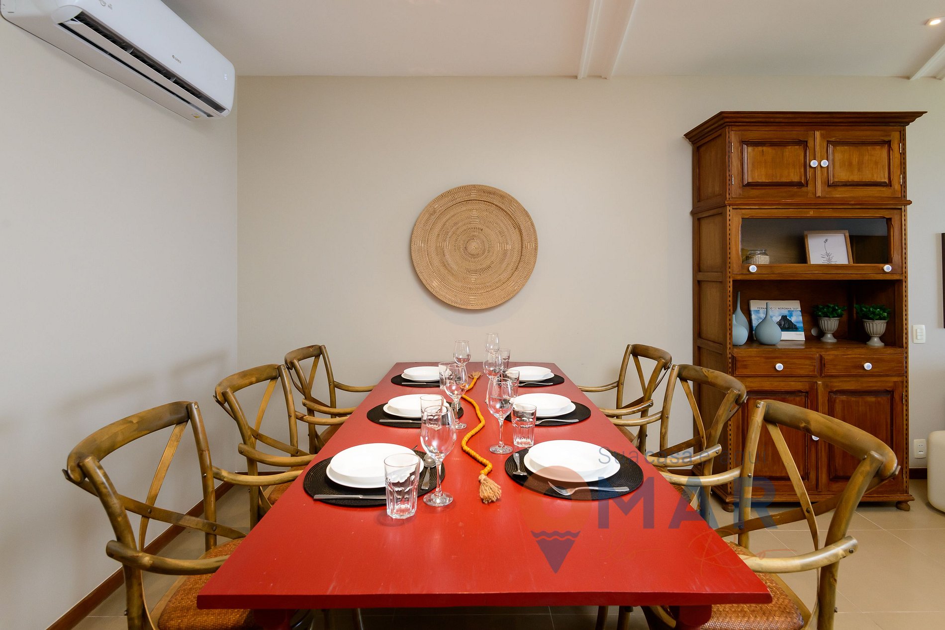 Sala: sofá, Smart TV com canais abertos (antena predial), ar-condicionado, mesa de jantar com seis cadeiras e cortina translúcida.