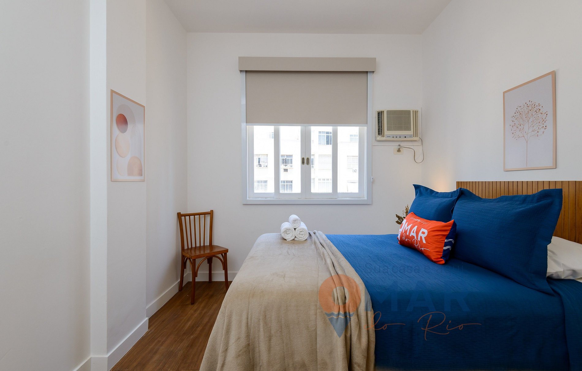 Quarto: Cama Casal (188cm x 138cm), ar-condicionado, armário com cabides, cadeira de apoio e persiana blackout.