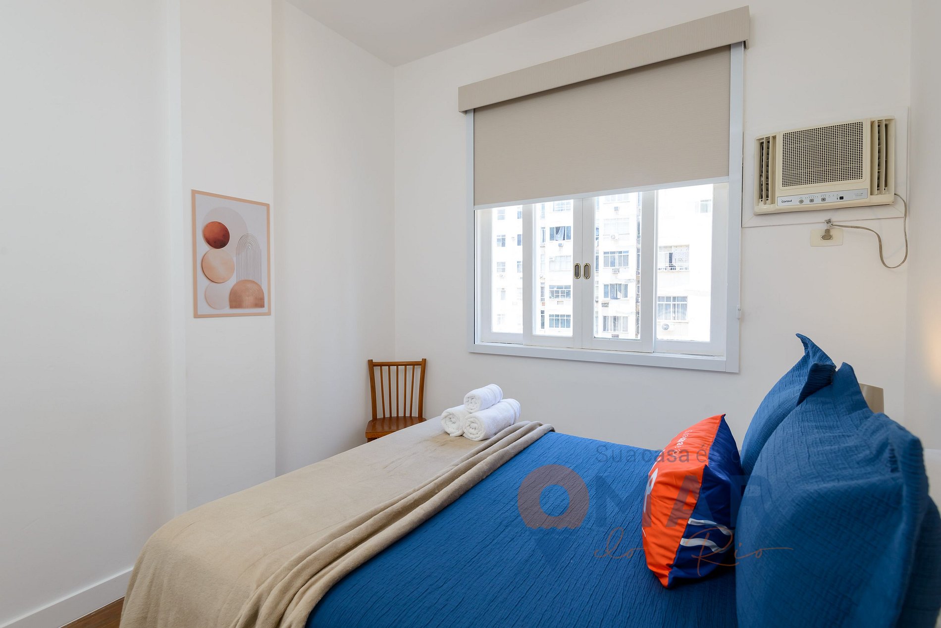 Quarto: Cama Casal (188cm x 138cm), ar-condicionado, armário com cabides, cadeira de apoio e persiana blackout.