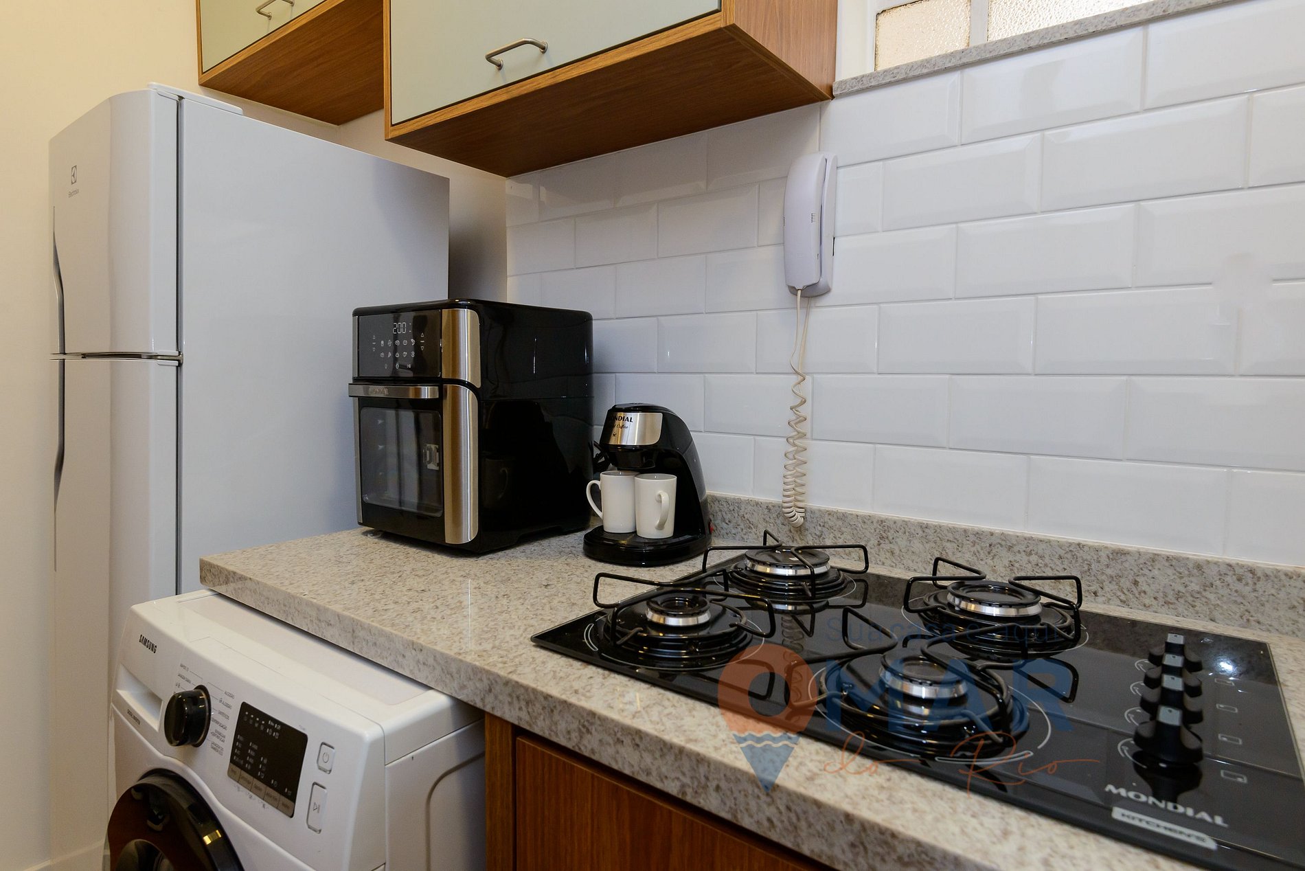 Cozinha: Geladeira, fogão, airfryer, micro-ondas, liquidificador, garrafa térmica, filtro d'água natural, cafeteira elétrica e utensílios de cozinha.