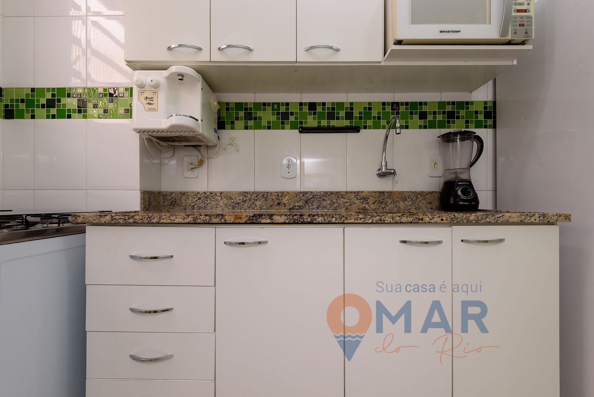 Cozinha: fogão, geladeira, forno, micro-ondas, cafeteira, liquidificador, purificador de água e utensílios de cozinha.
