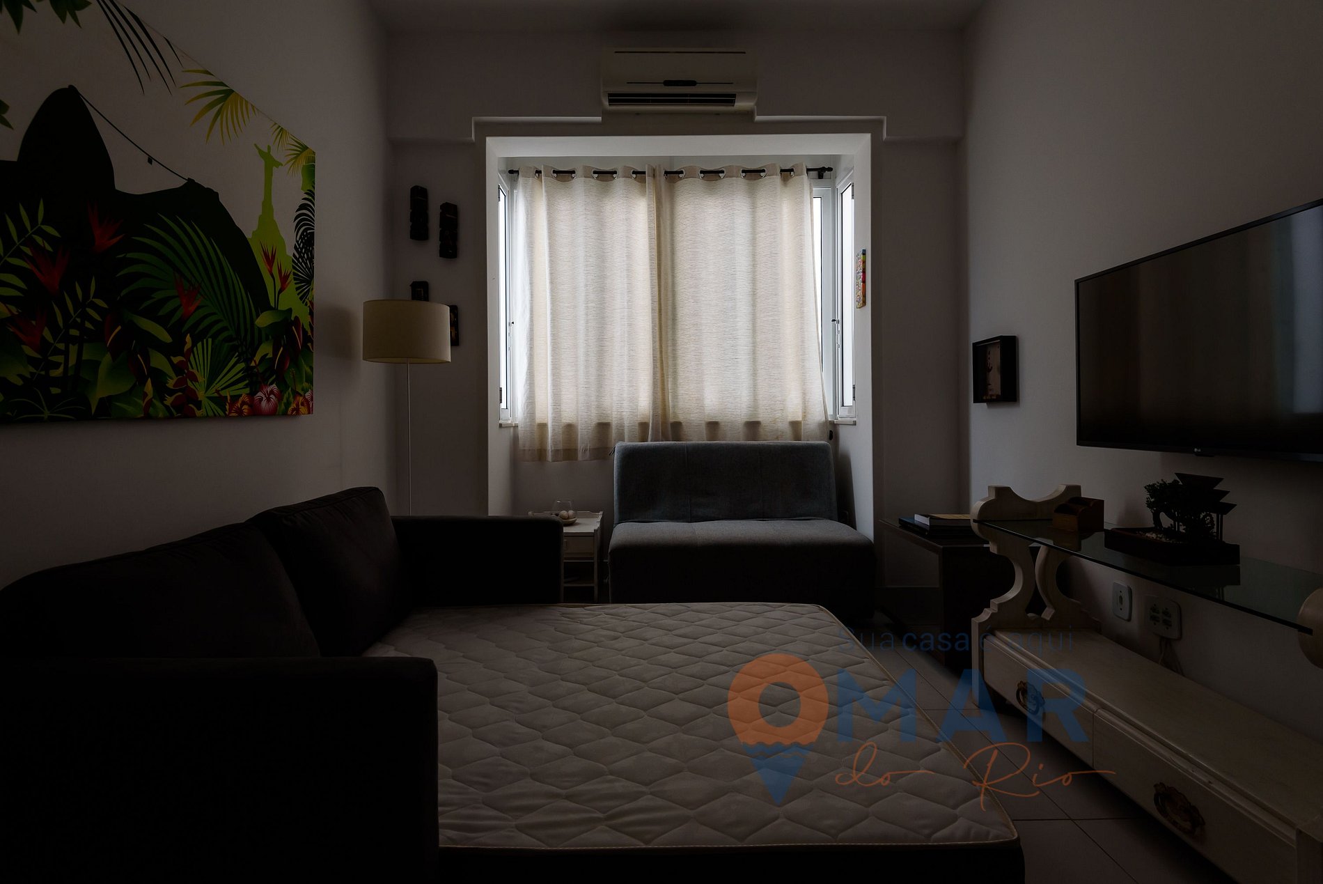 Sala: sofá-cama (188cm x 125cm), sofá, Smart TV com canais, ar condicionado, mesa de jantar + assentos e cortina.