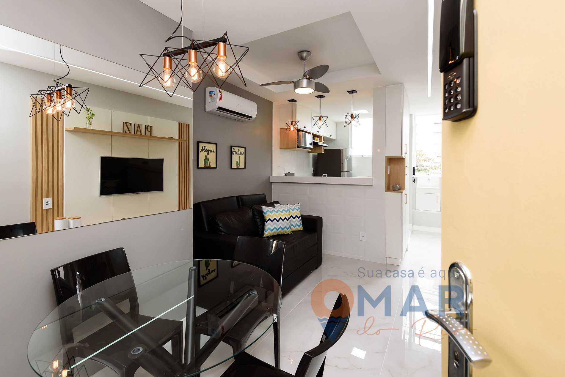 Sala: Smart TV com canais a cabo (Claro TV), Sofá-cama (198cm x 158cm), ar-condicionado split, mesa com quatro cadeiras e persiana blackout.