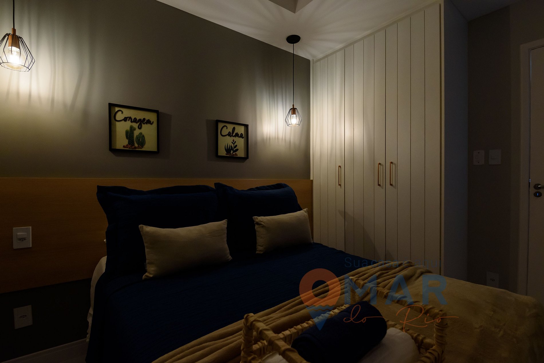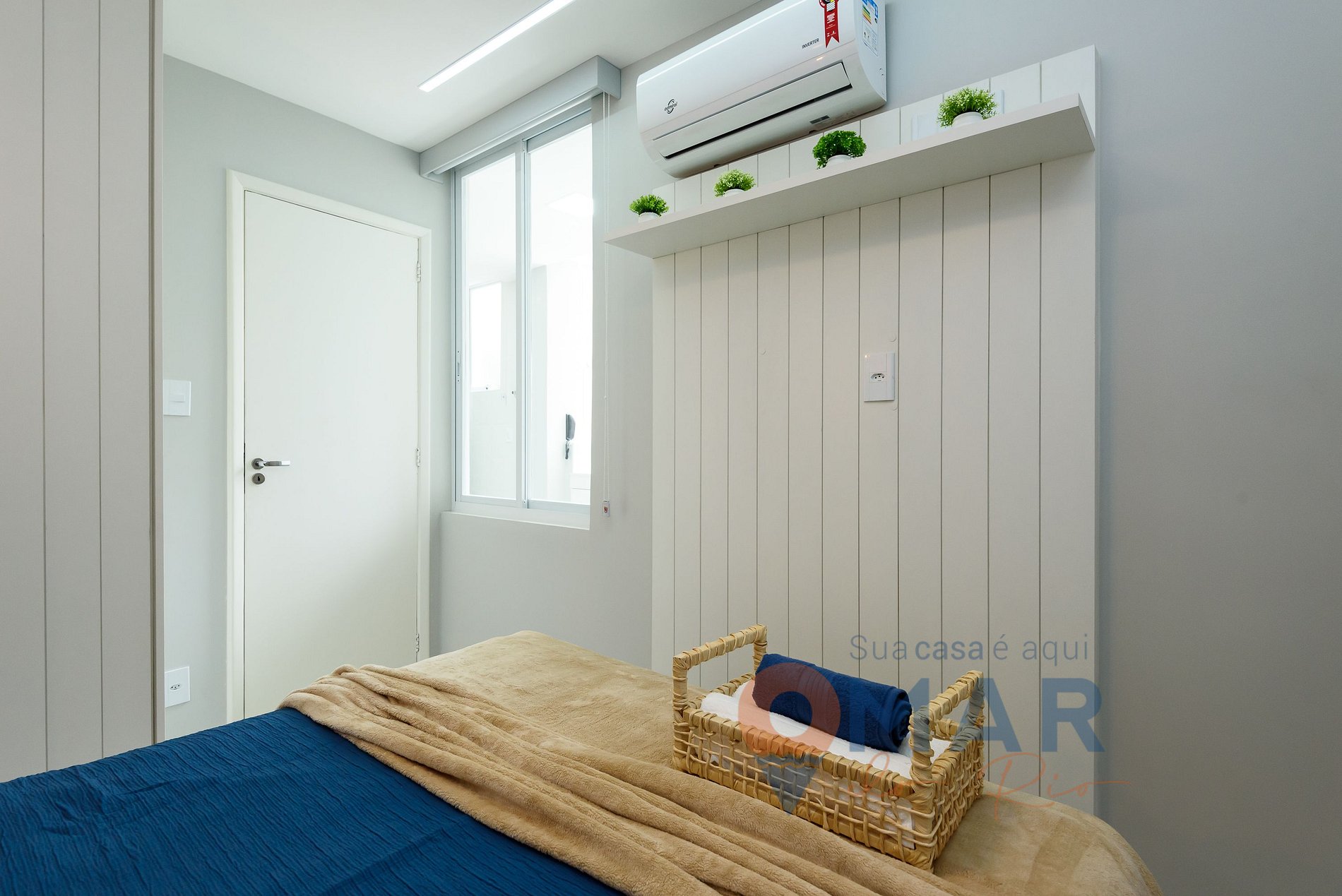 Quarto: Cama Queen Size (198cm x 158cm), Smart TV, ar-condicionado split, armário com cabides, espelho de corpo inteiro e persiana blackout.