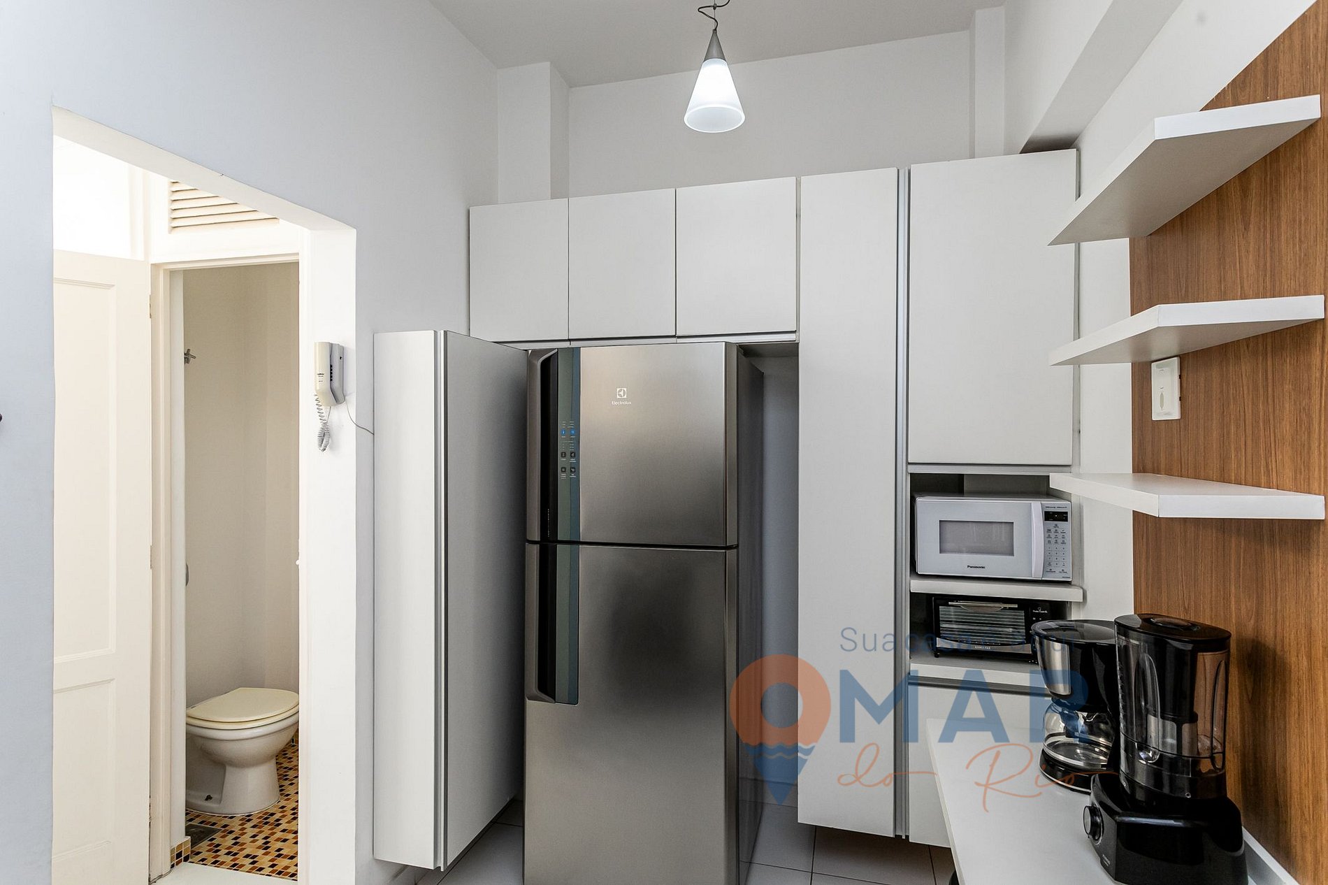 Cozinha: fogão, geladeira, forno, micro-ondas, cafeteira, liquidificador e utensílios.