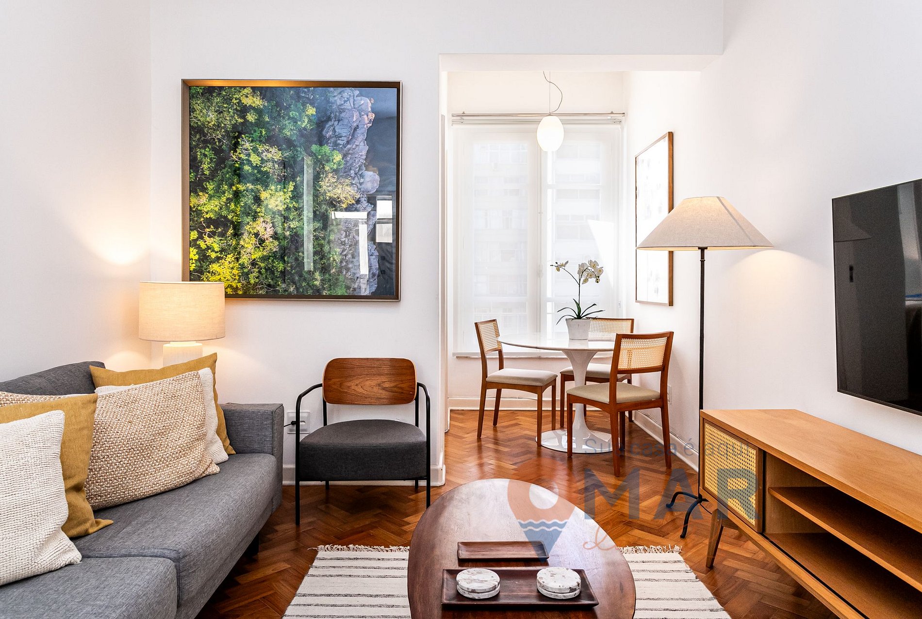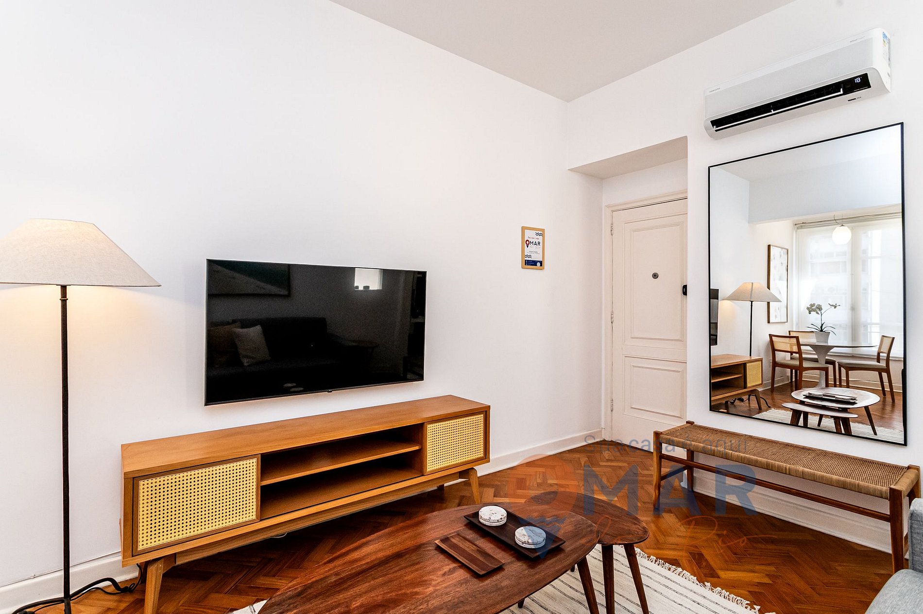 Sala: sofá, ar-condicionado, Smart TV com canais, mesa de jantar com assentos e cortina.