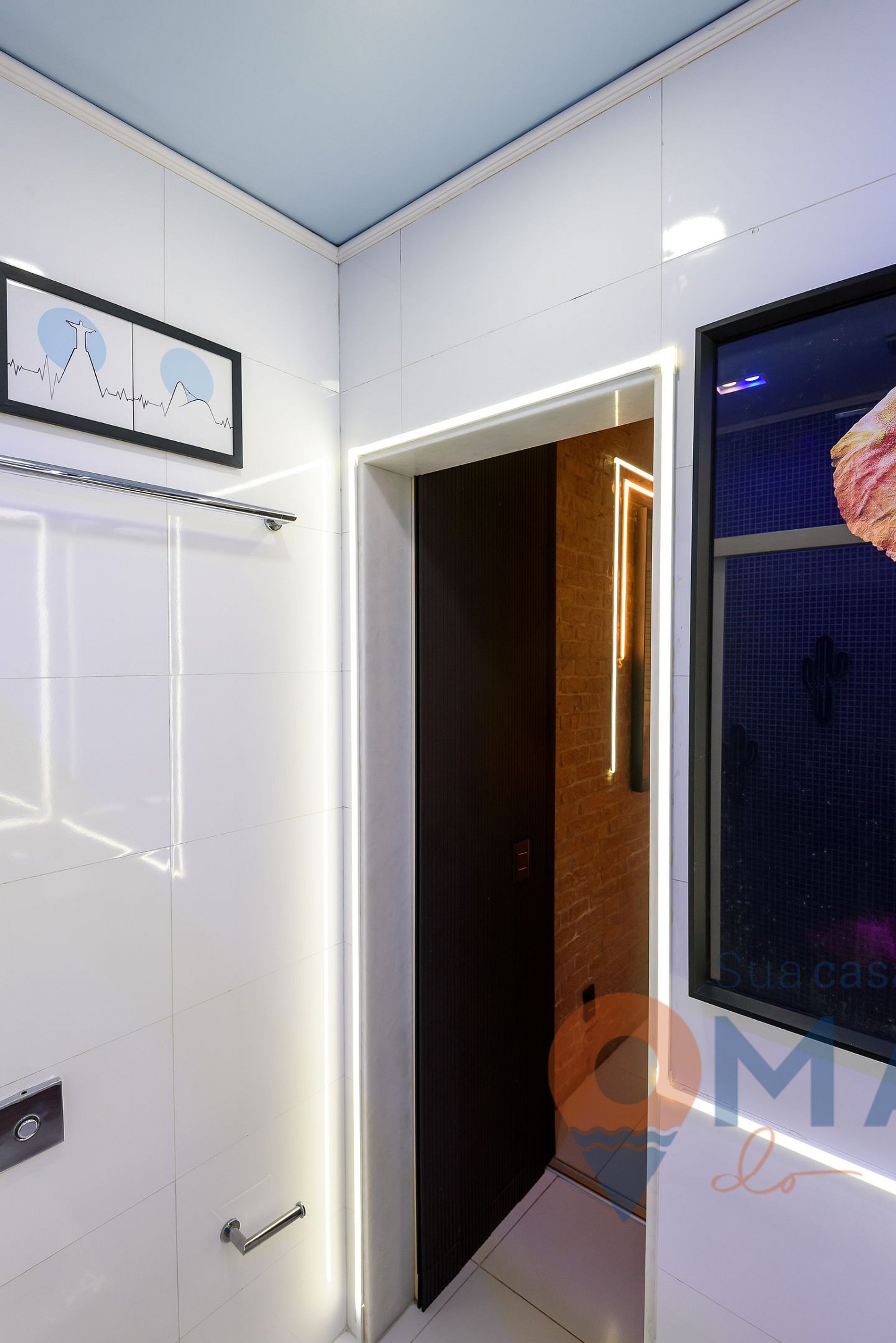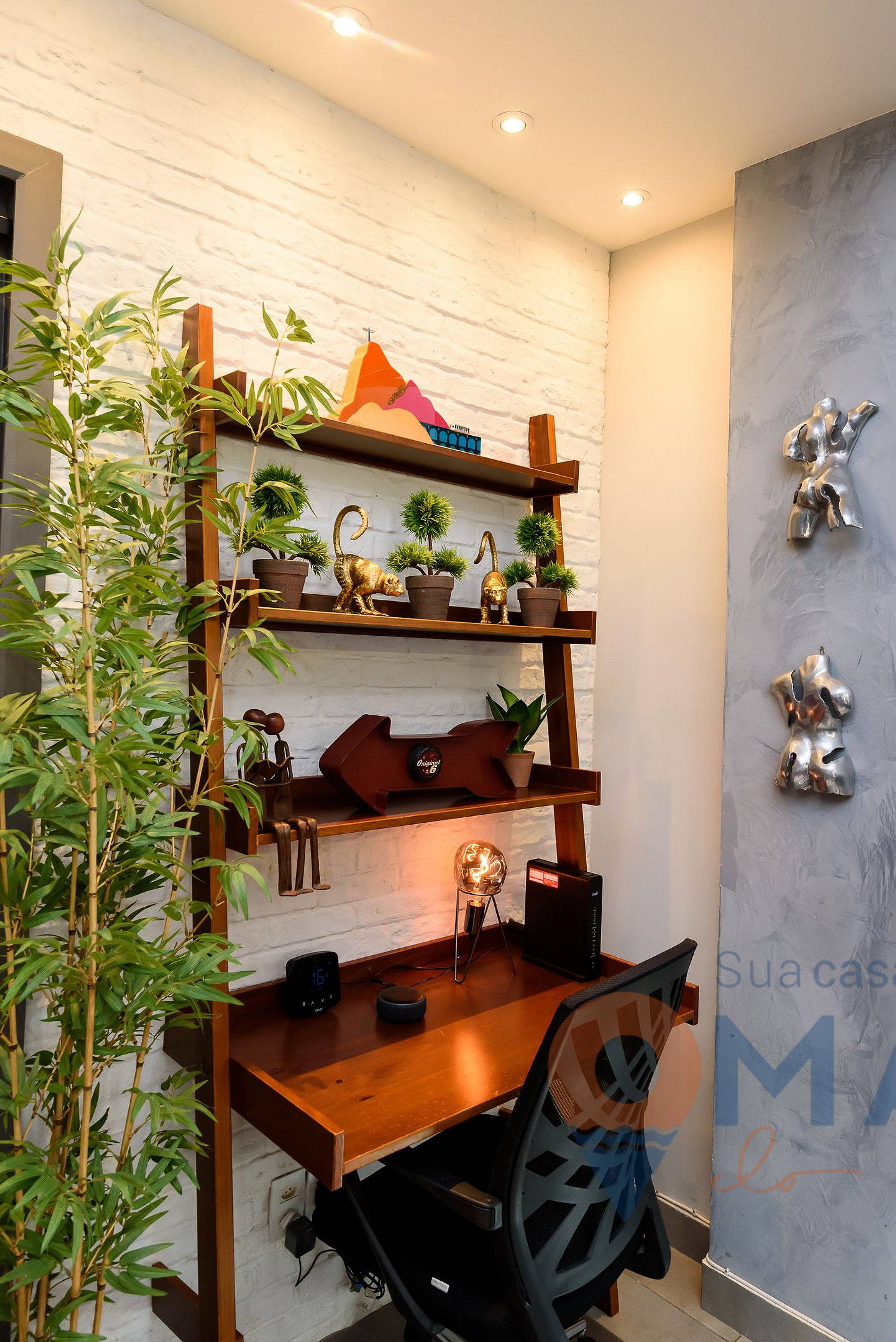 Sala: Sofá-cama (1,68cm de largura), estação para trabalho (workstation), ar-condicionado split, ventilador de teto, Alexa e espelho.