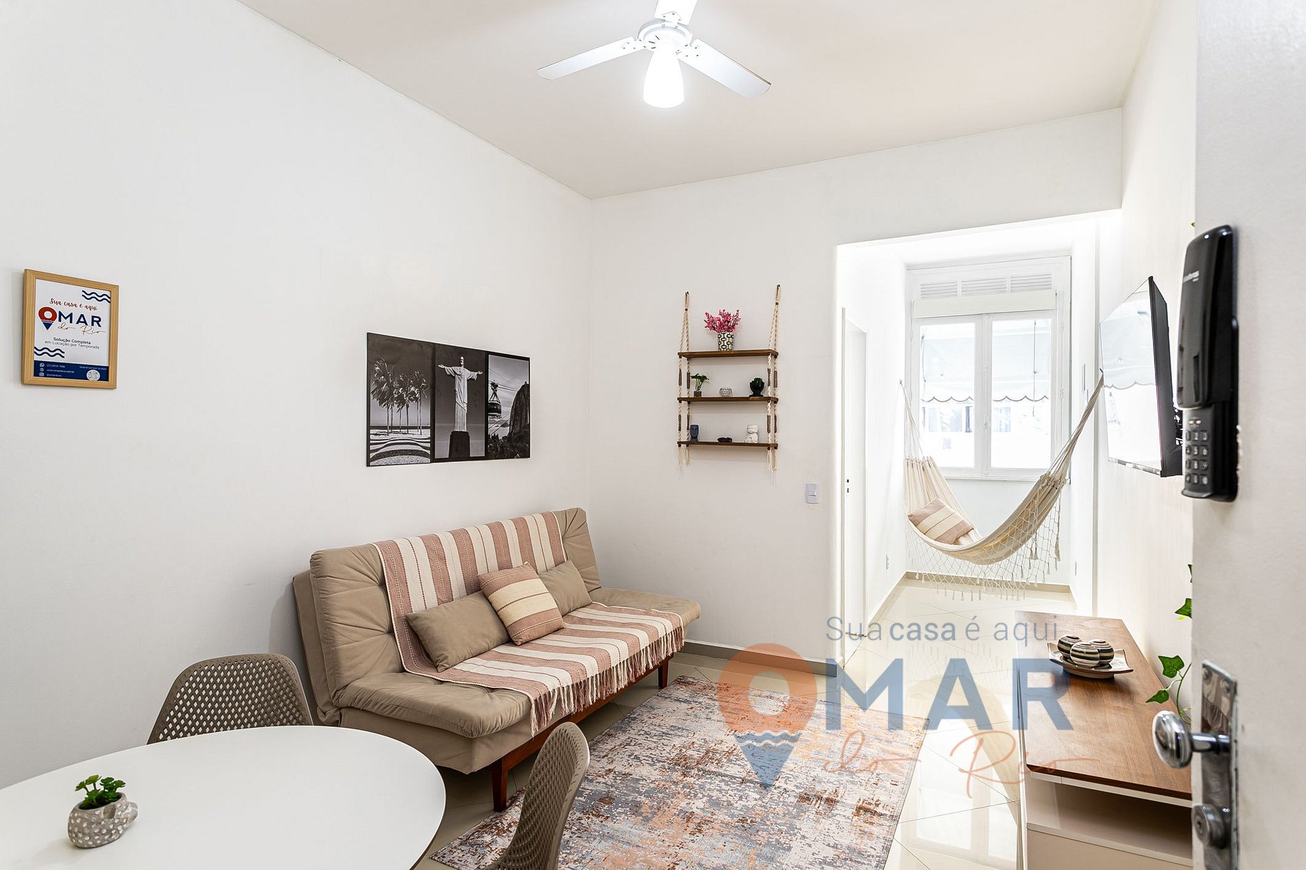 Sala de estar: Sofá-cama (126cm x 188cm), Smart TV com canais abertos, rede de descanso, ventilador de teto.