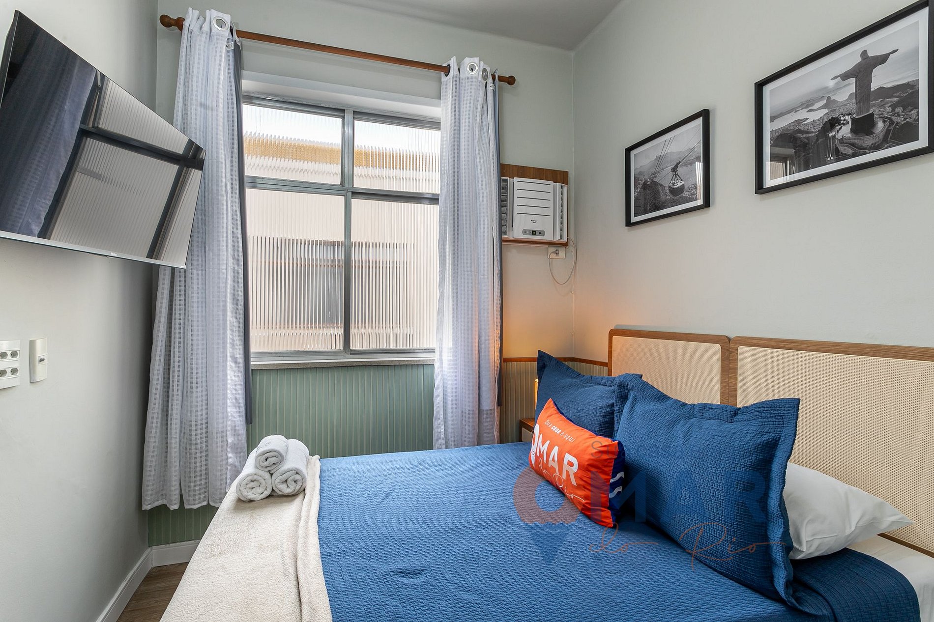 Quarto: cama casal (188cm x 138cm), ar-condicionado, smart TV 40", cortina blackout, armário com cabides e espelho de corpo inteiro.
