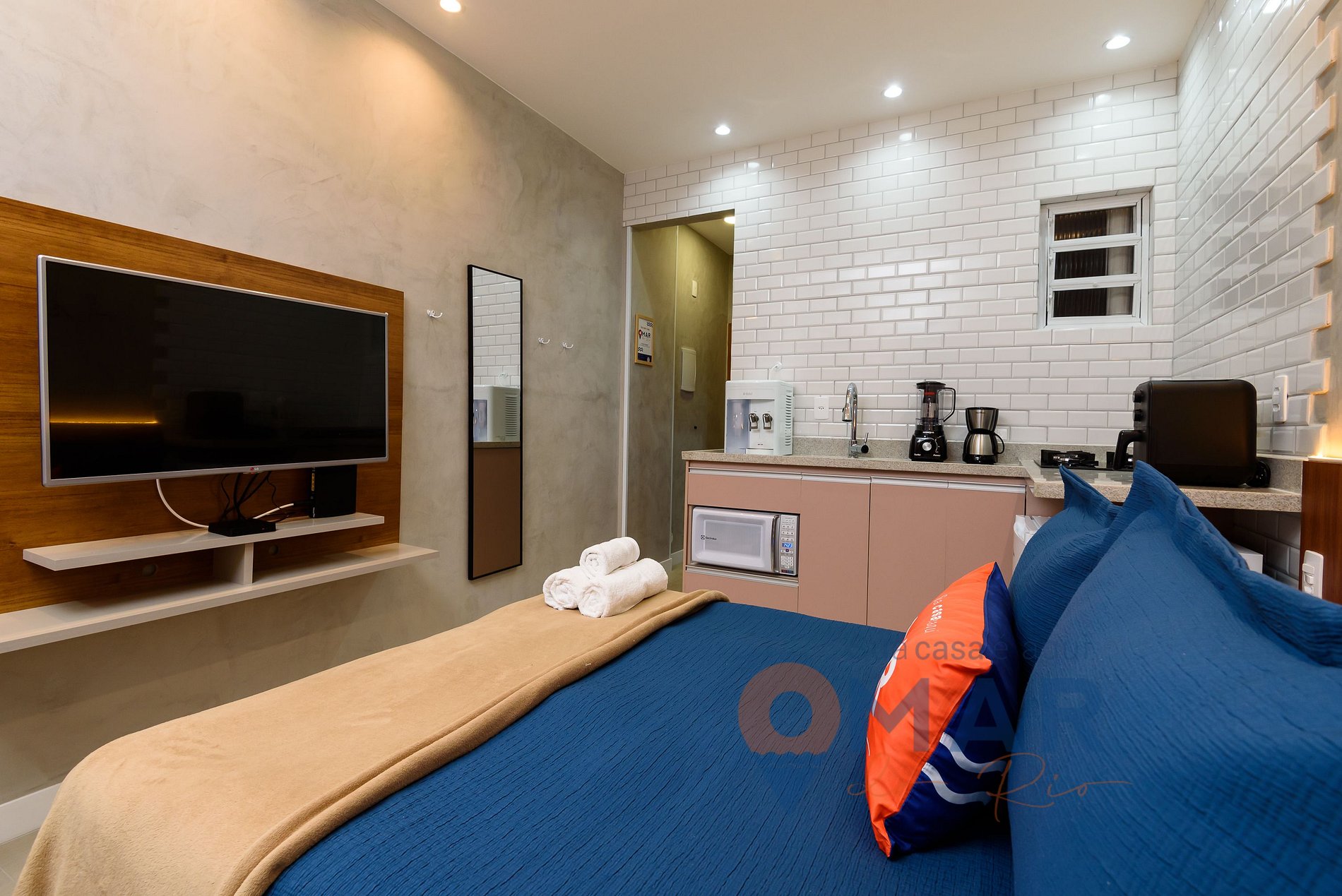 Studio: cama casal (188cm x 138cm), ar-condicionado split, televisão 43" com Claro Box TV (acesso aos aplicativos de streaming e canais abertos), cortina blackout, arara de roupas com cabides, suporte para malas, espelho de corpo inteiro e mesa de jantar com assentos.