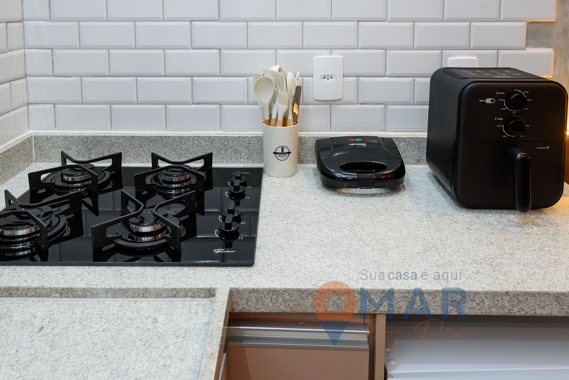 Cozinha: frigobar, fogão 4 bocas, micro-ondas, airfryer, purificador de água com água gelada e natural, cafeteira elétrica, liquidificador, sanduicheira, espremedor de laranja e utensílios de cozinha.
