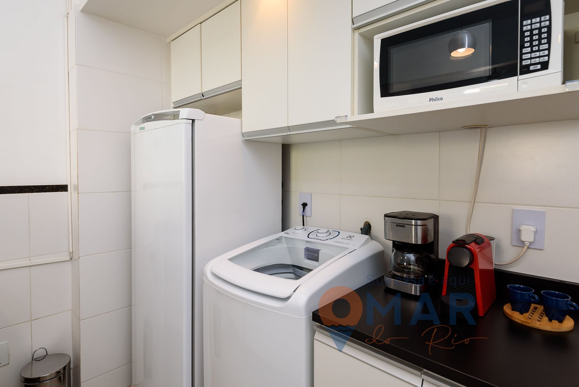 Cozinha: cooktop 4 bocas, forno, geladeira, micro-ondas, cafeteira, cafeteira expresso, liquidificador e utensílios.