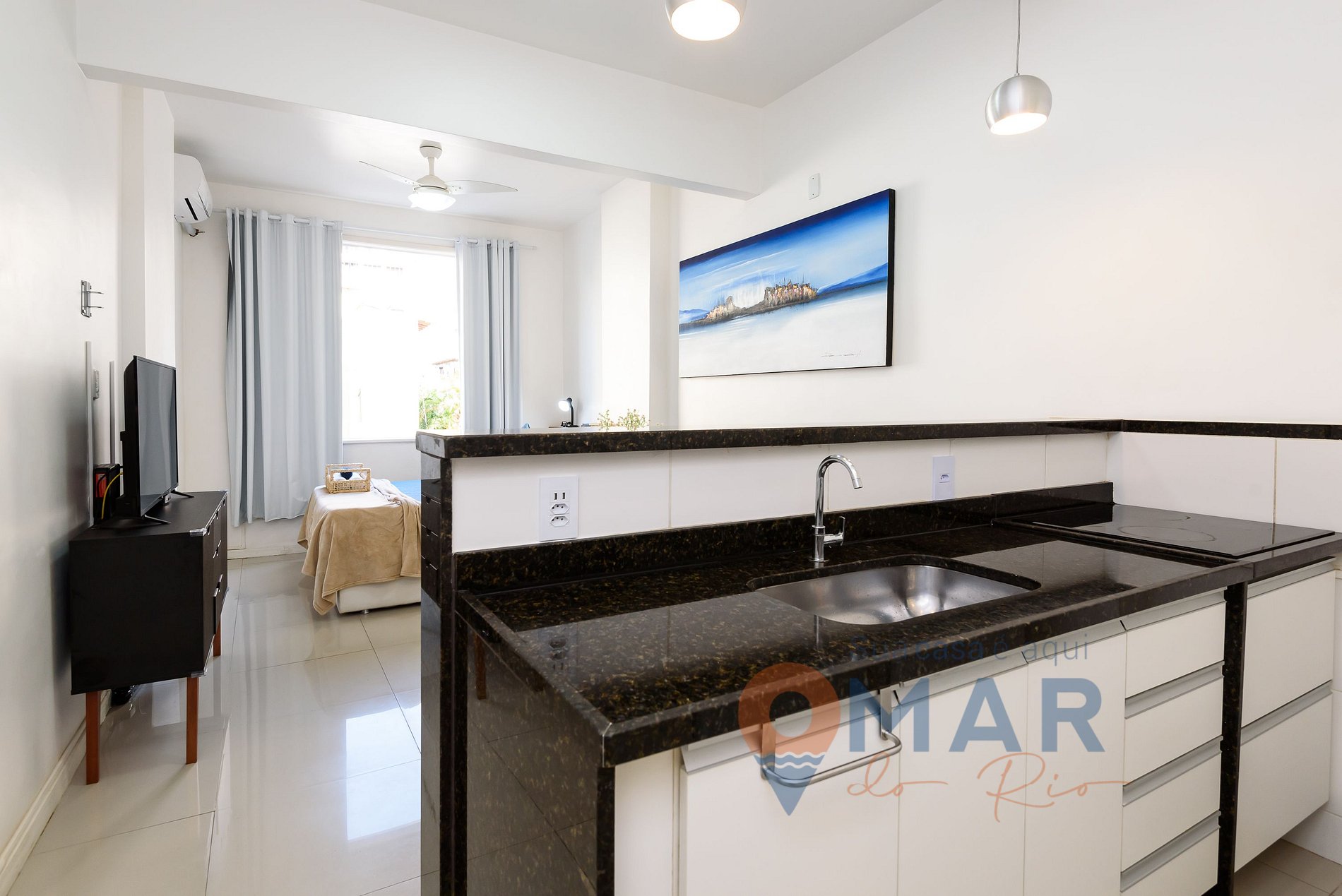 Estúdio: Cama Queen Size (198cm x 158cm), sofá cama, ar condicionado split, workstation, Smart TV com canais a cabo, mesa de jantar + assentos, ventilador e cortina blackout.