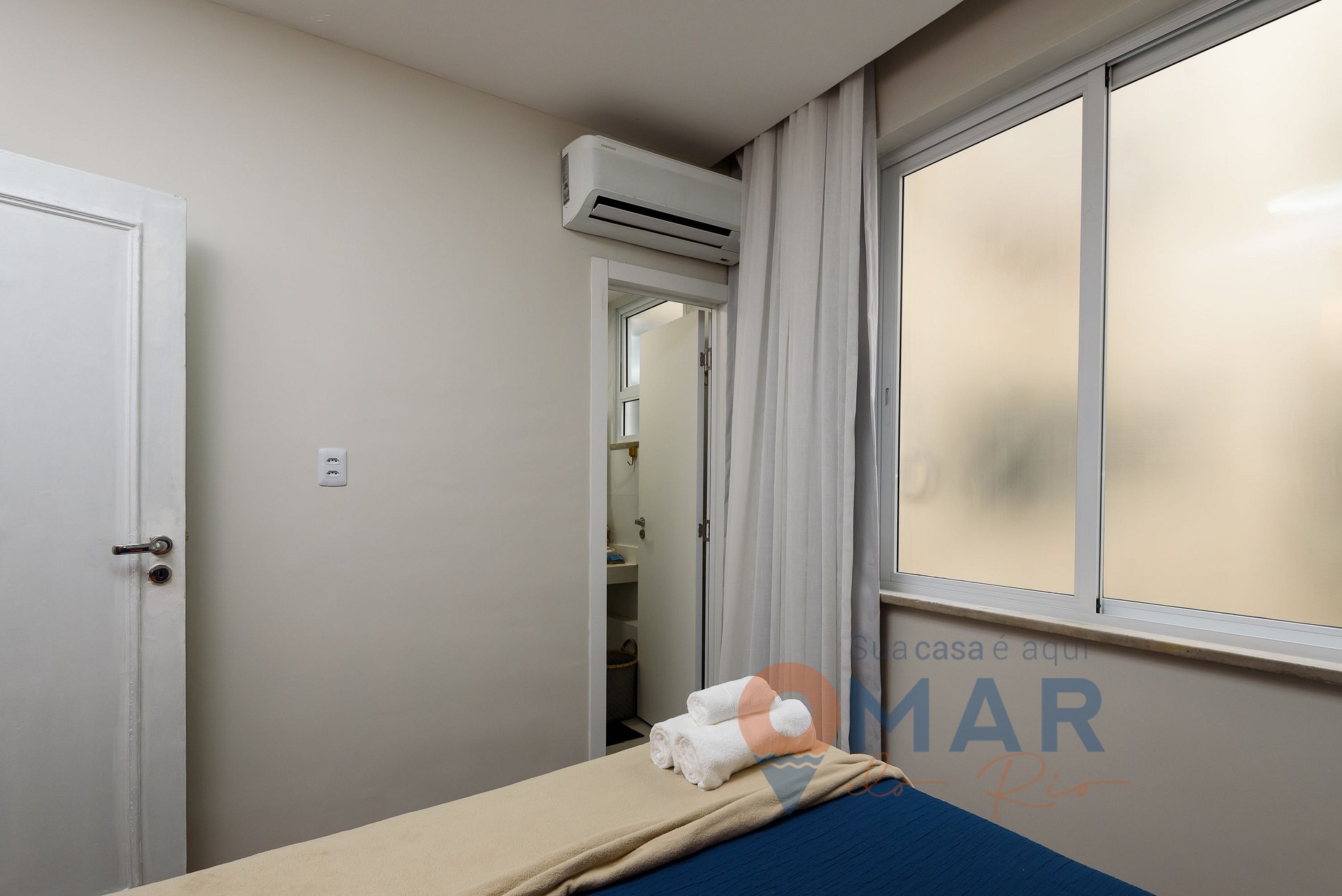 Suíte: cama queen size (196cm x 156cm), ar-condicionado split, armário fechado com cabides, espelho, cortina blackout e translúcida, e janela antirruído.