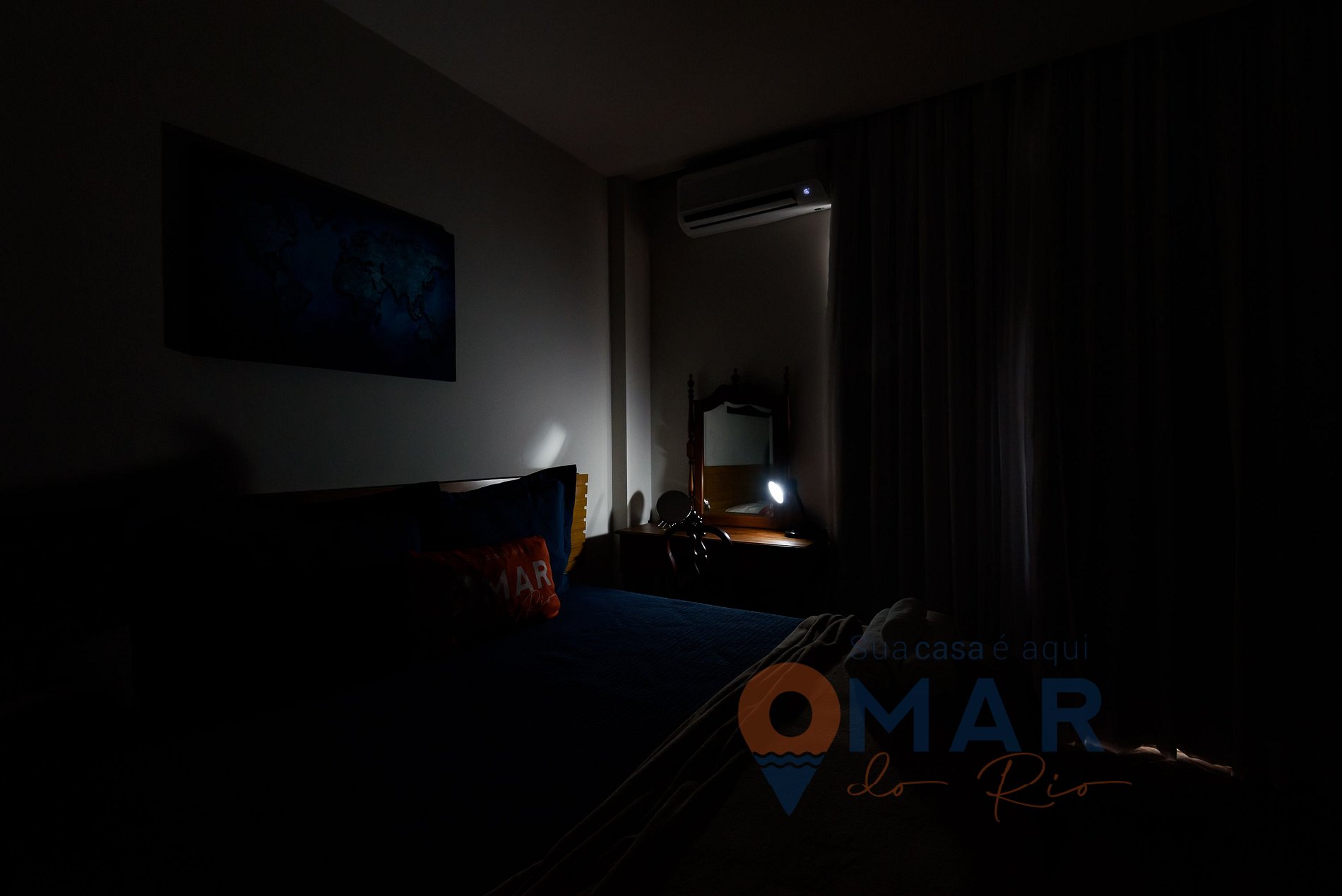 Quarto Duplo: cama queen size (192cm x 156cm), ar-condicionado split, armário aberto com cabides, espelho, penteadeira, e cortina blackout e translúcida.