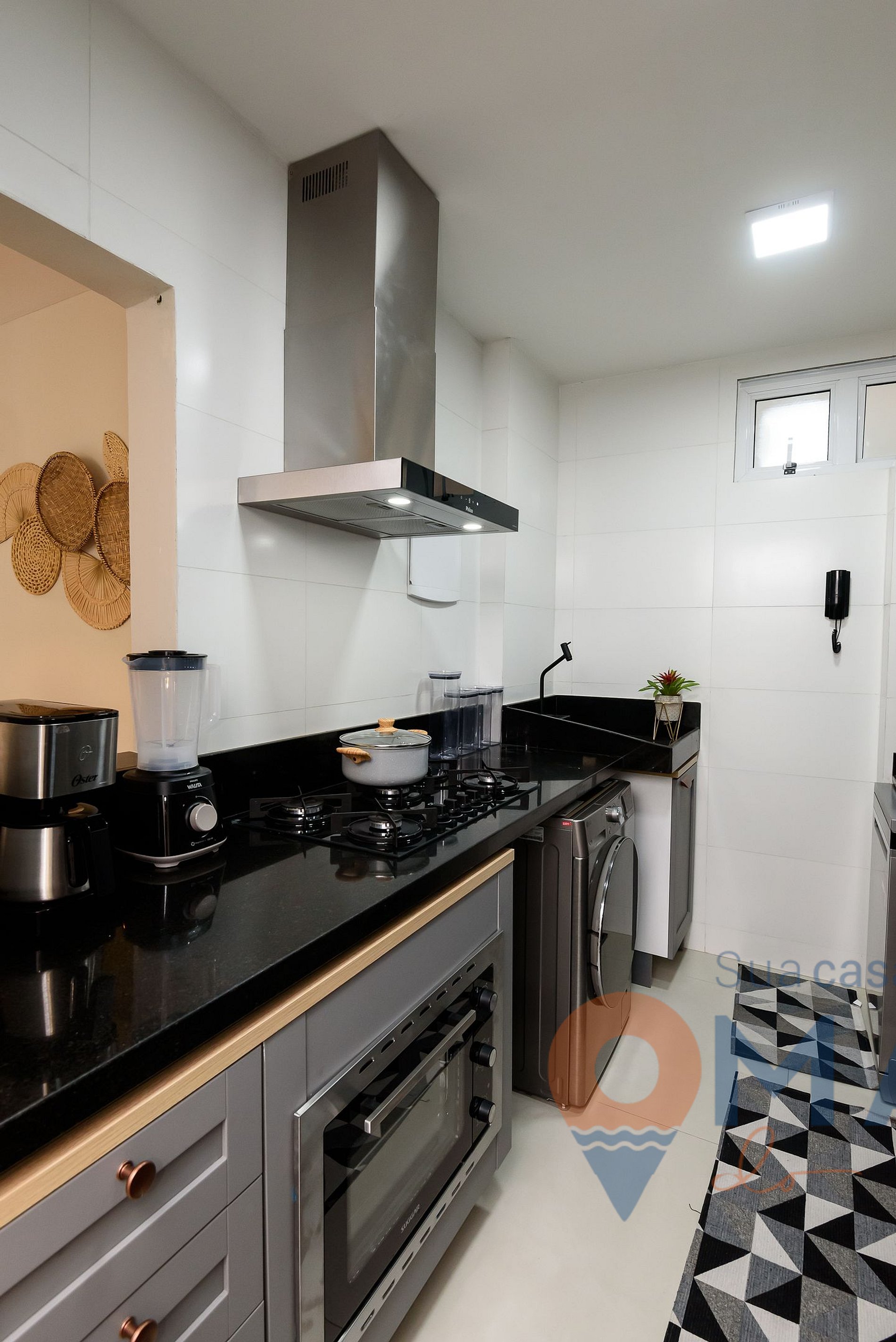 Outros: secador de cabelo, ferro de passar roupa com tábua, máquina lava e seca (12/7kg), varal para secar roupas e aspirador de pó.
