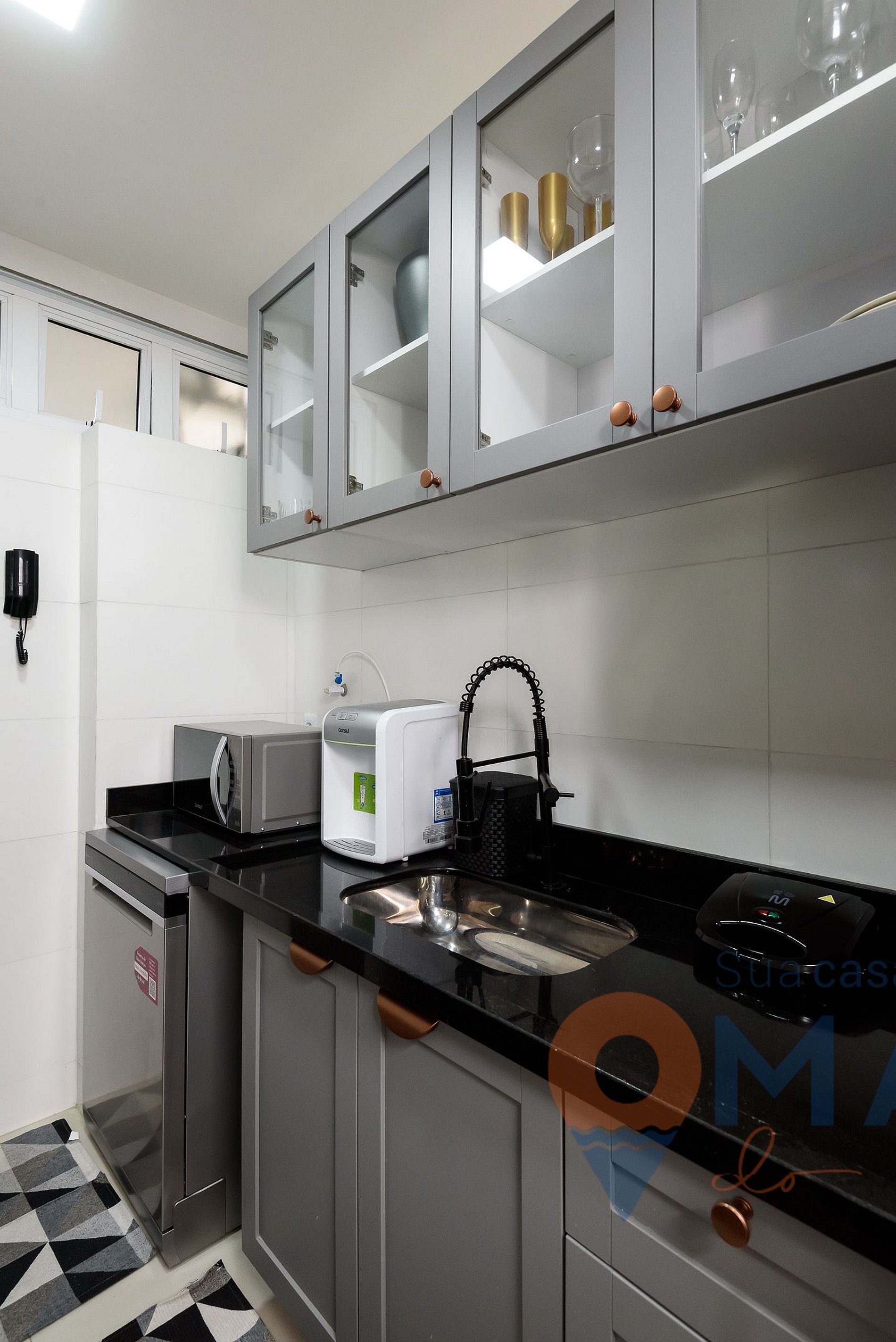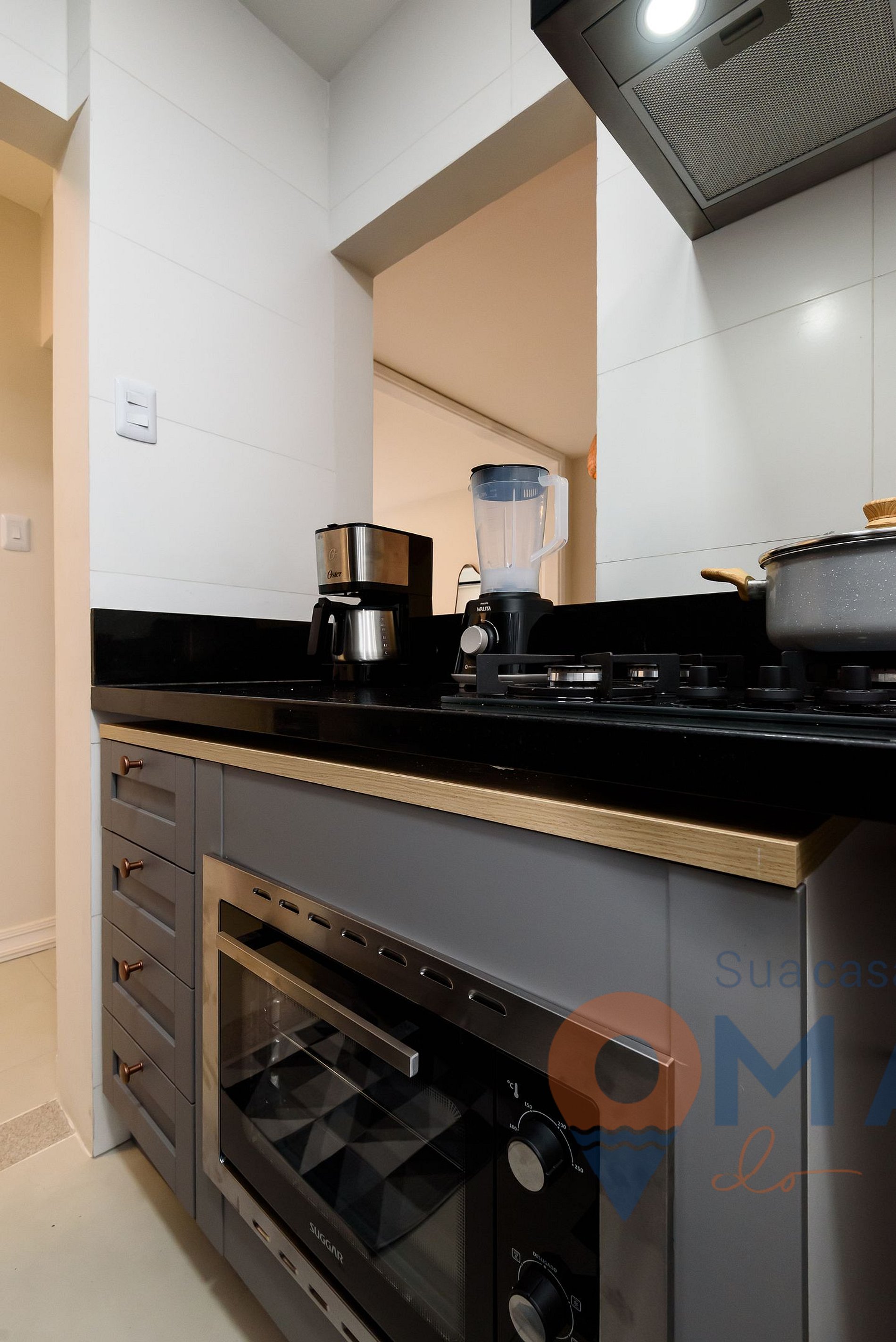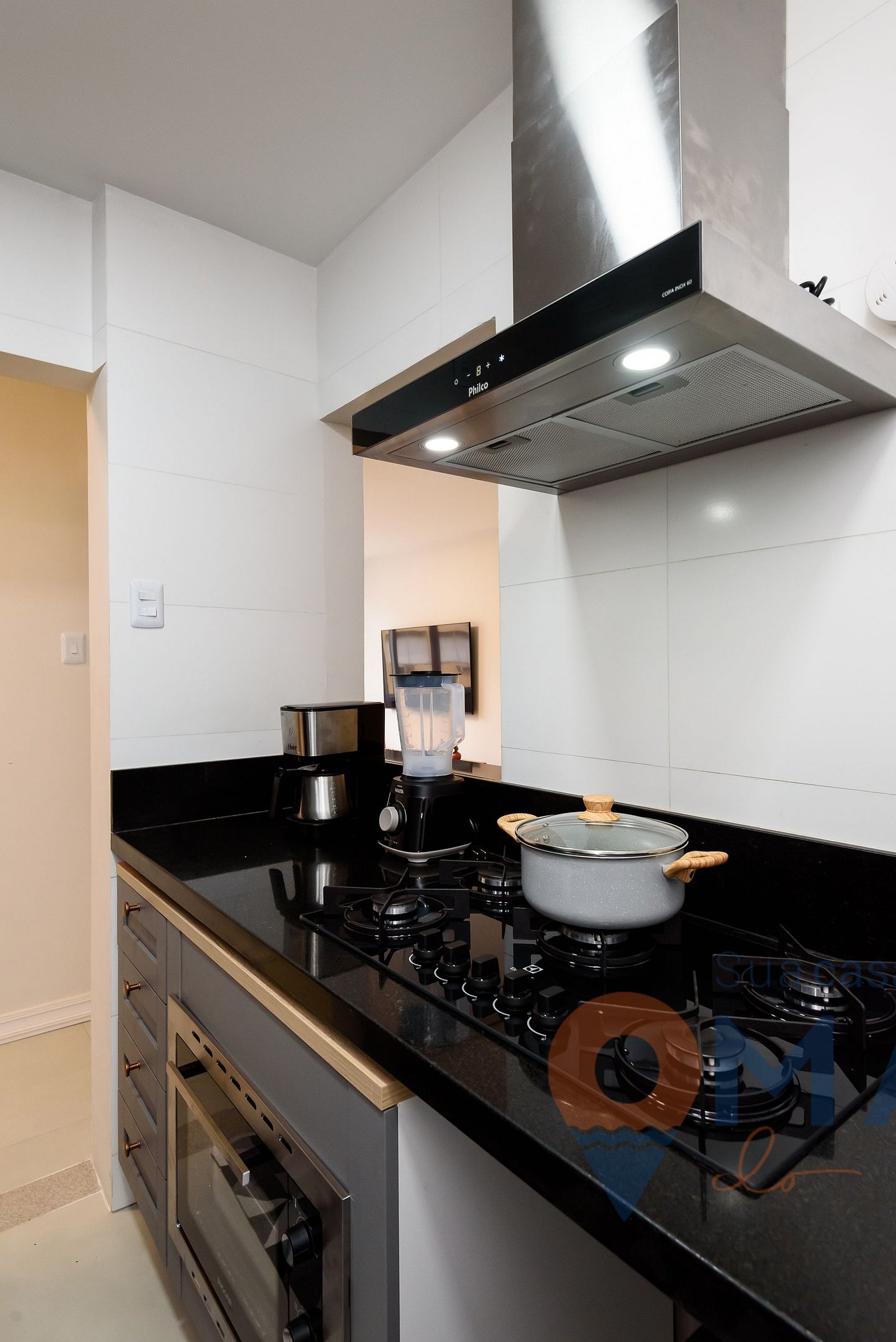 Cozinha: geladeira, fogão cooktop 5 bocas, forno elétrico, micro-ondas, cafeteira elétrica, chaleira, liquidificador, purificador de água (água natural e gelada), sanduicheira, lava louças e utensílios para cozinhar.