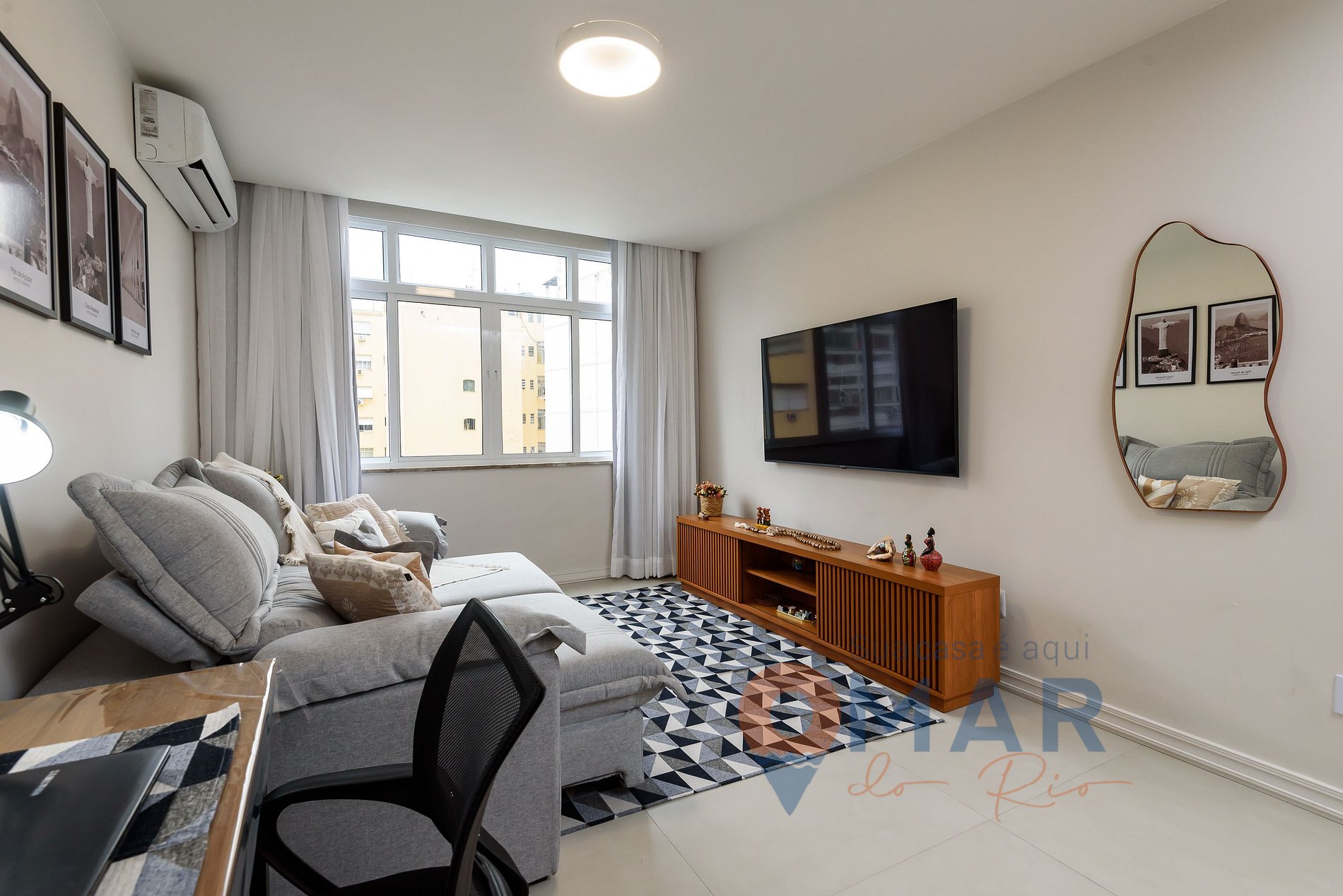 Sala: sofá, Smart TV 65" com canais abertos (antena digital), ar-condicionado split, mesa de jantar com assentos, espelho de corpo inteiro, estação de trabalho, cortina blackout e translúcida, e janela antirruído.