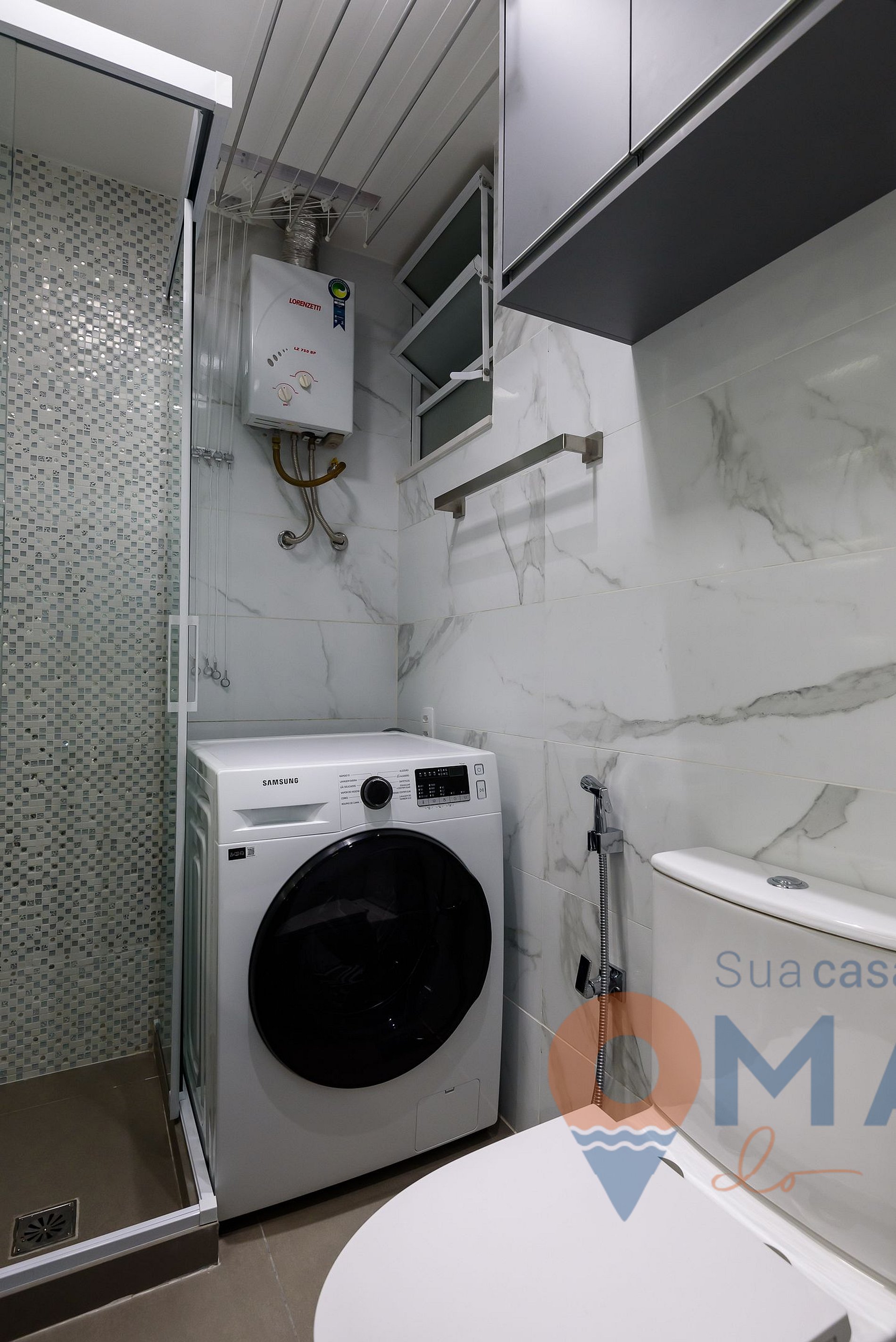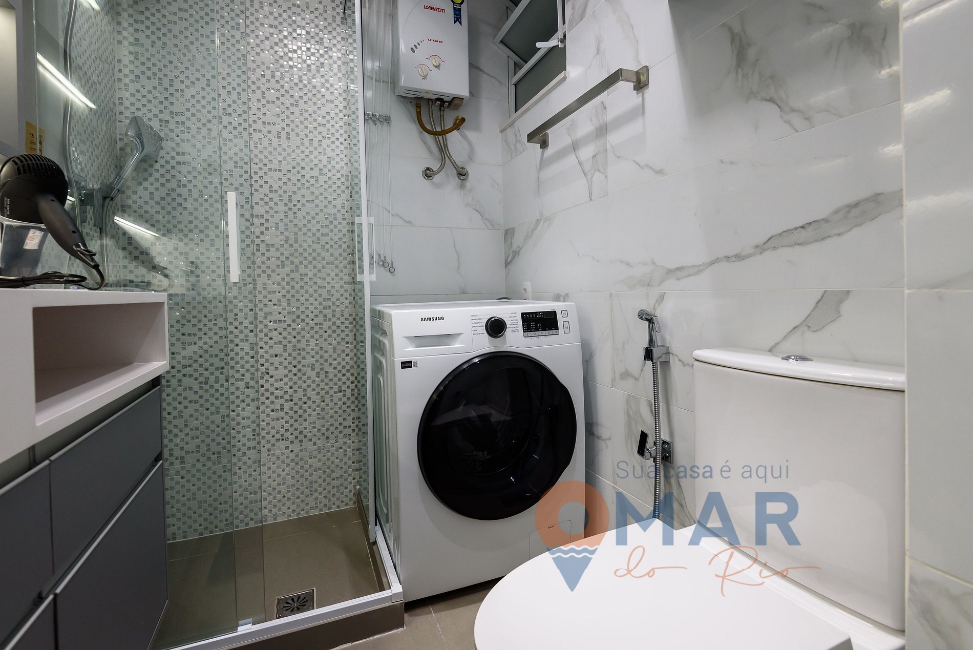 Outros: secador de cabelos, ferro de passar roupa com tábua, varal para secar roupas e máquina de lavar 11kg.