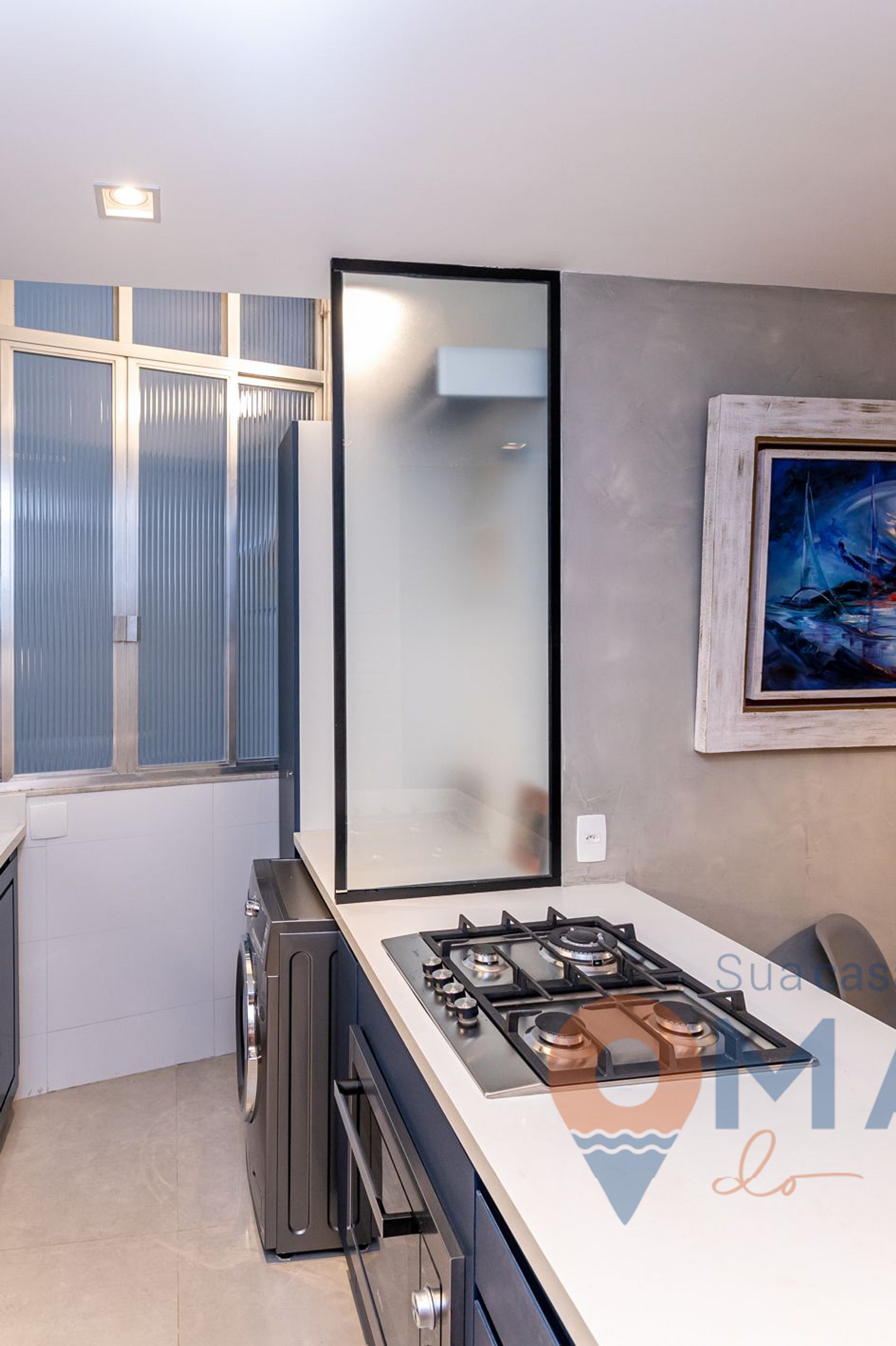 Cozinha: cooktop quatro bocas, geladeira, micro-ondas, cafeteira, liquidificador, airfryer e utensílios.