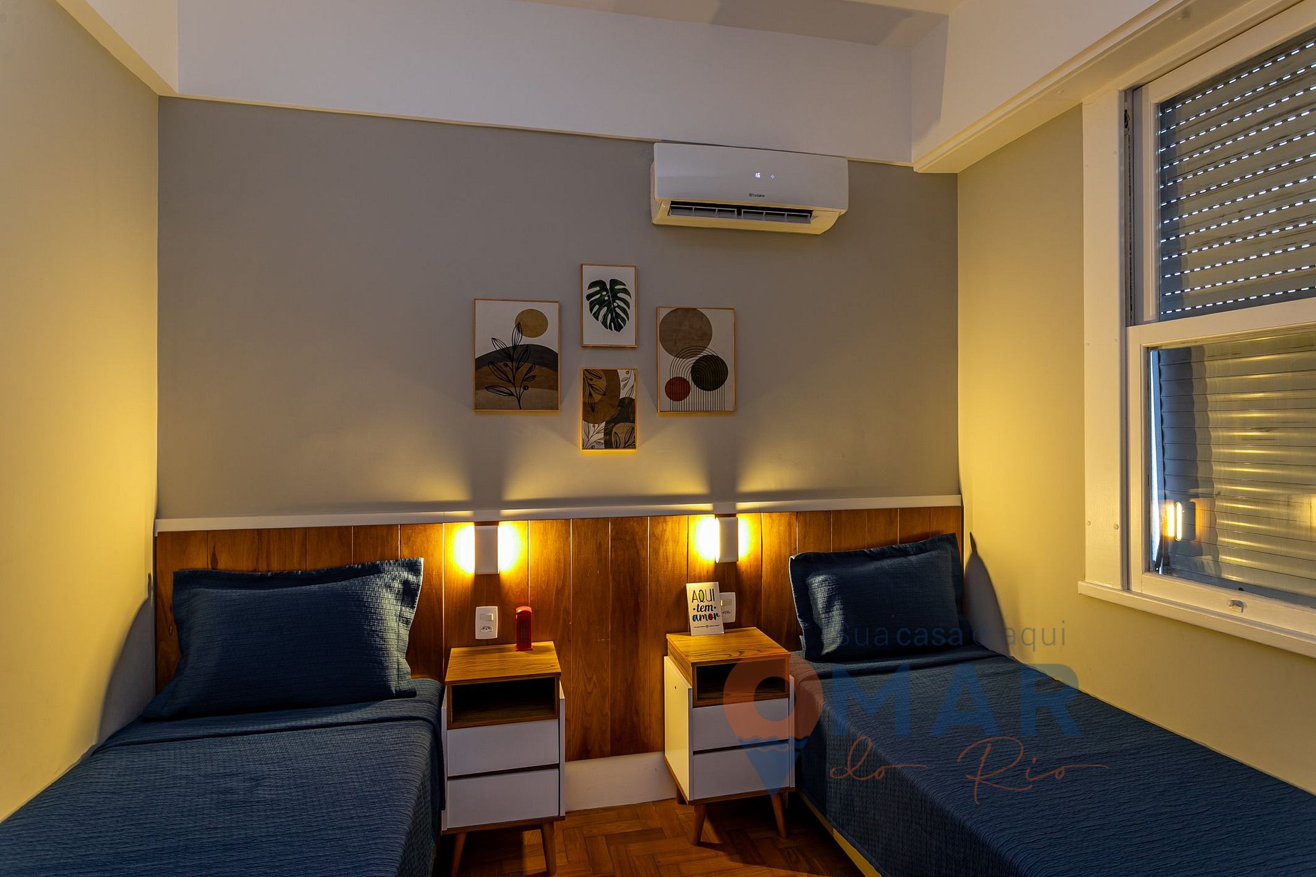 Quarto: duas camas de solteiro (188cm de x 88cm), ar-condicionado, armário aberto e cortina blackout.