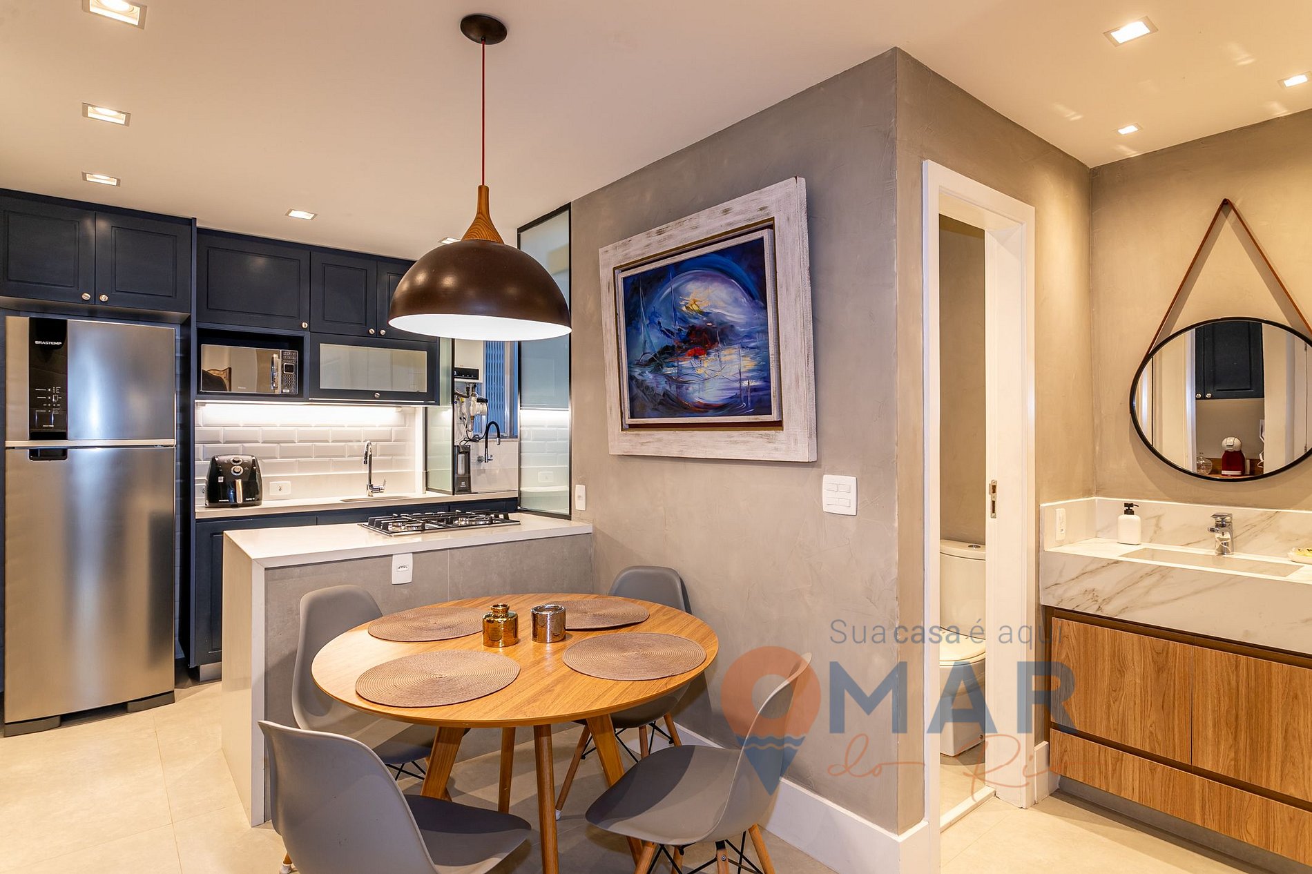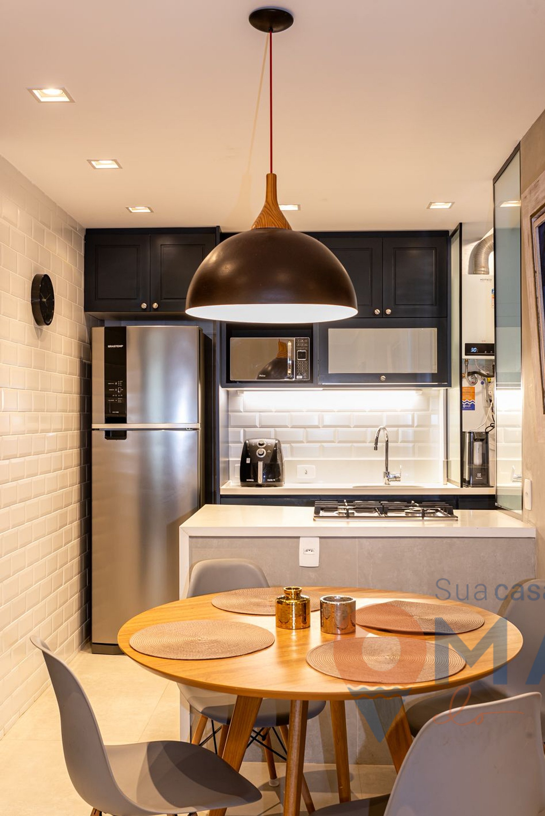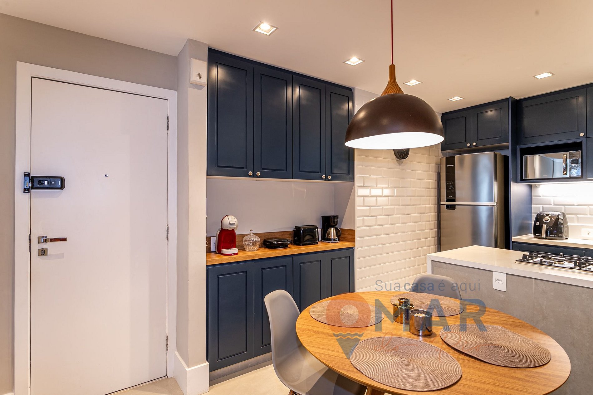 Cozinha: cooktop quatro bocas, geladeira, micro-ondas, cafeteira, liquidificador, airfryer e utensílios.