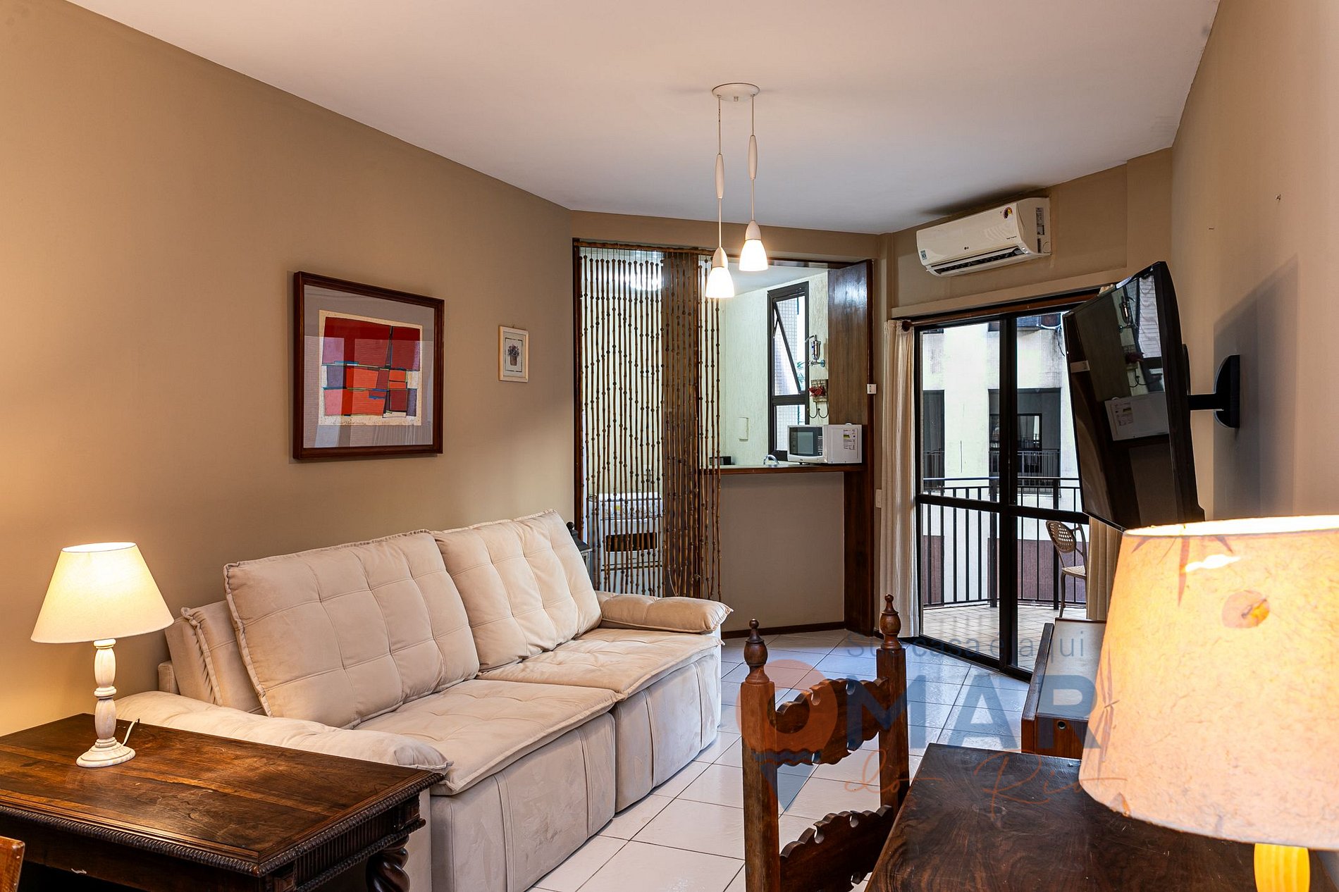 Sala: sofá cama de casal (1,38cmx1,80cm), Smart TV com canais, ar condicionado e mesa de jantar + 4 assentos.