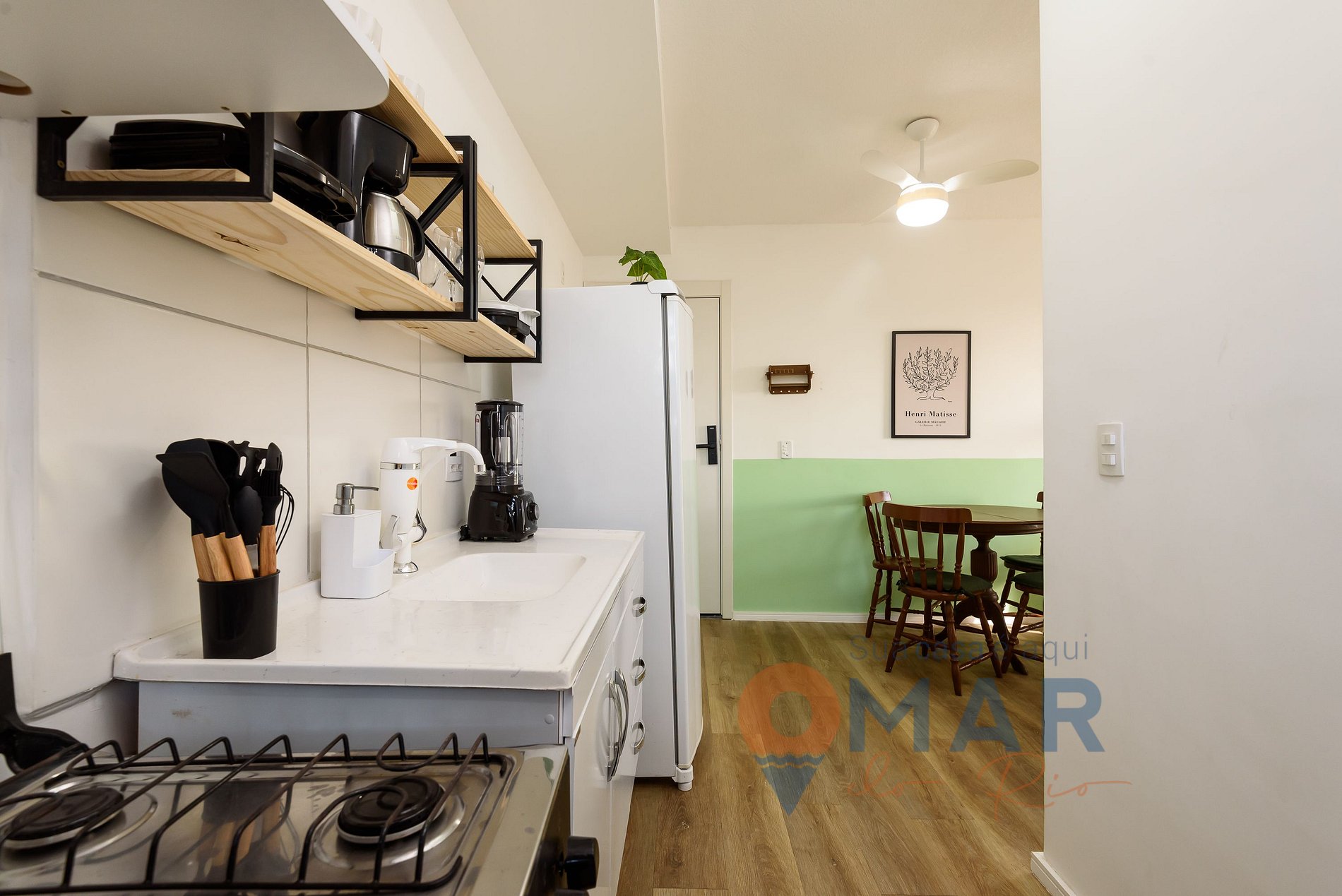 Cozinha: geladeira, fogão 4 bocas com forno, micro-ondas, cafeteira elétrica, liquidificador, sanduicheira, filtro de torneira com água natural, chaleira e utensílios para cozinhar.