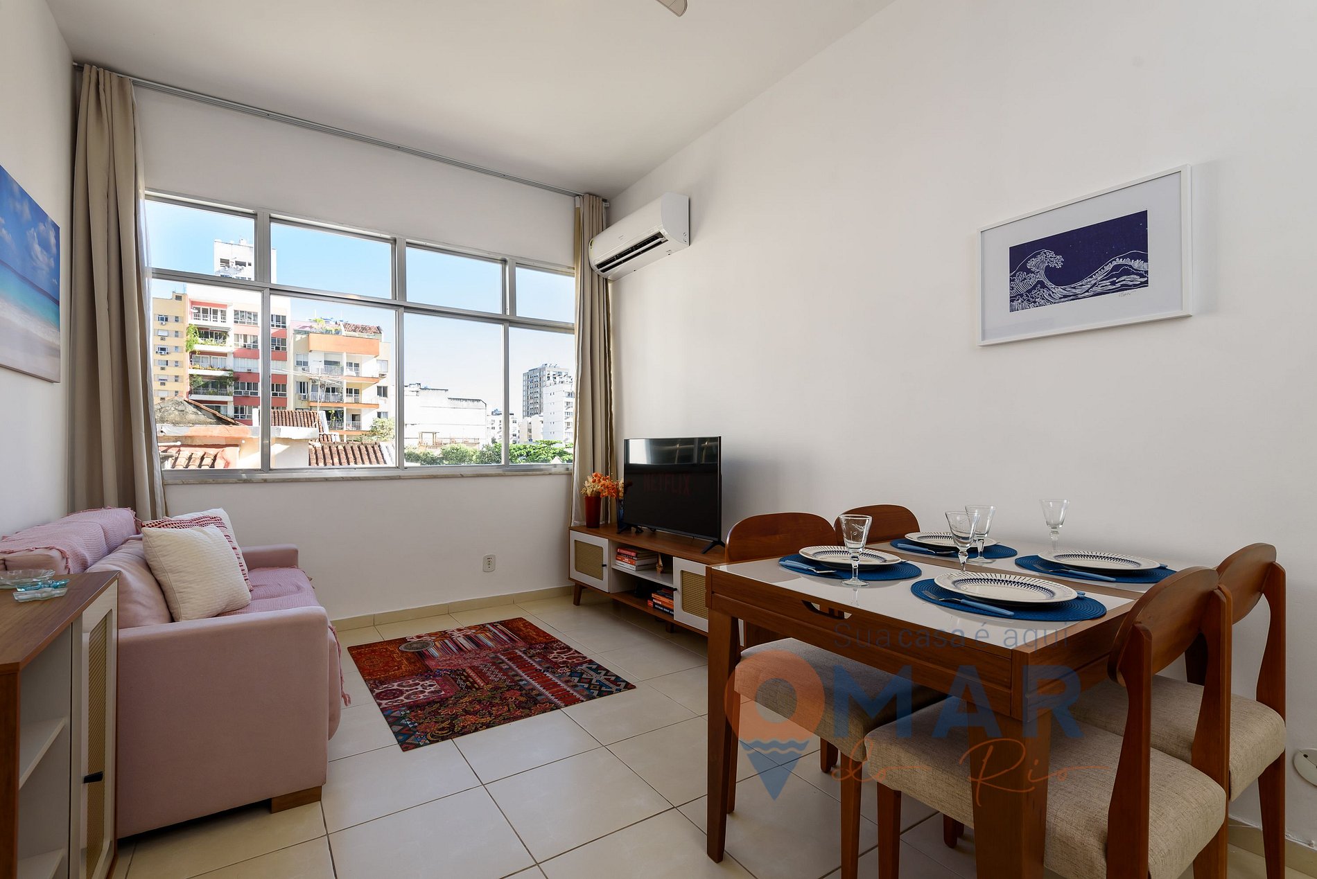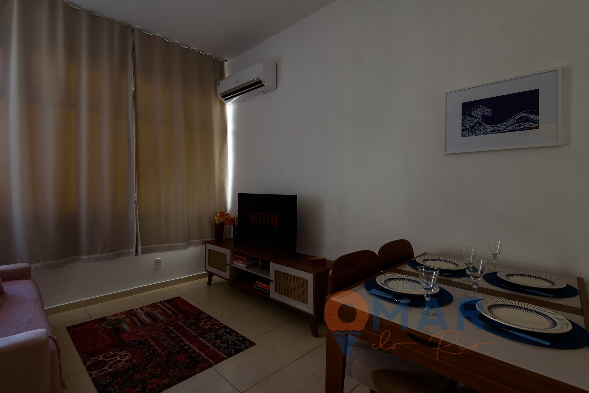 Sala: Sofá, Smart TV com antena digital para canais abertos, ar-condicionado split, cortina semiblackout e mesa de jantar com cadeiras.