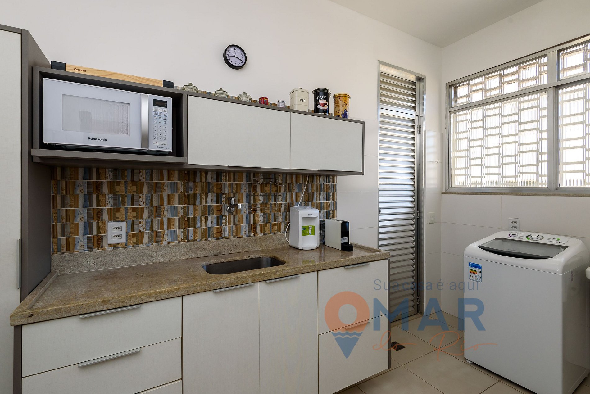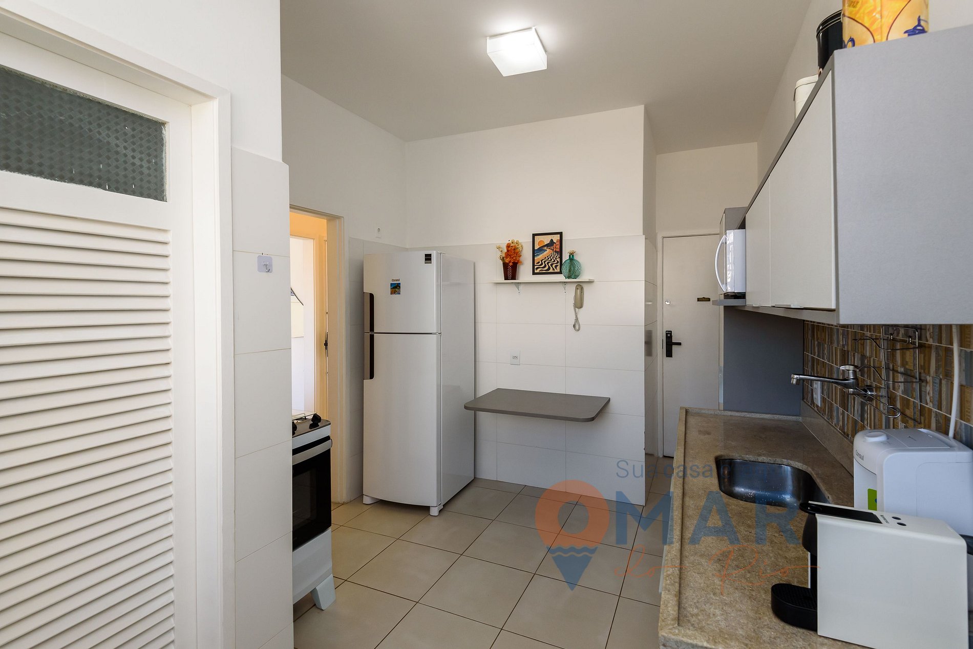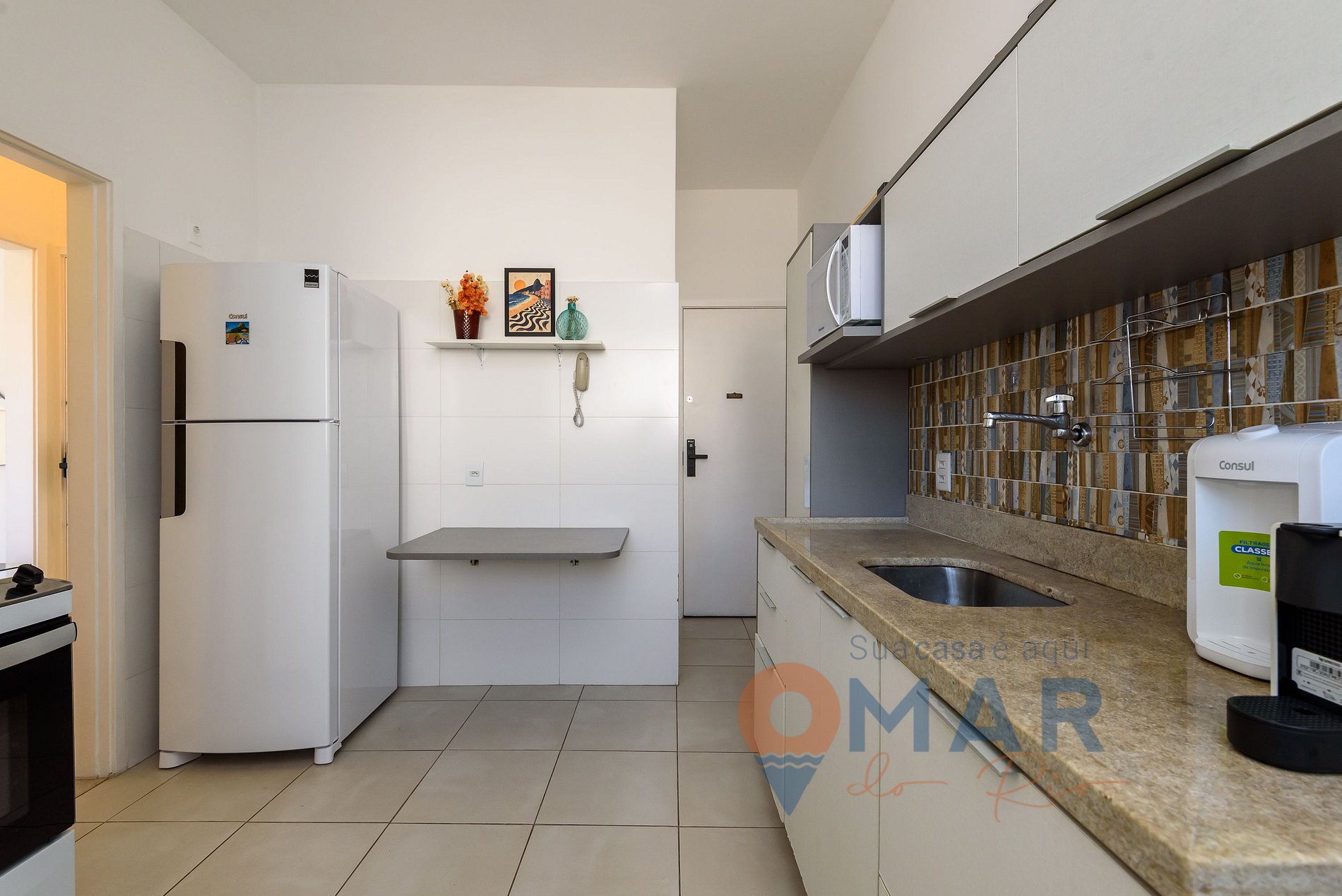 Cozinha: Geladeira, fogão 4 bocas, micro-ondas, cafeteira Nespresso, liquidificador, sanduicheira e purificador de água natural.