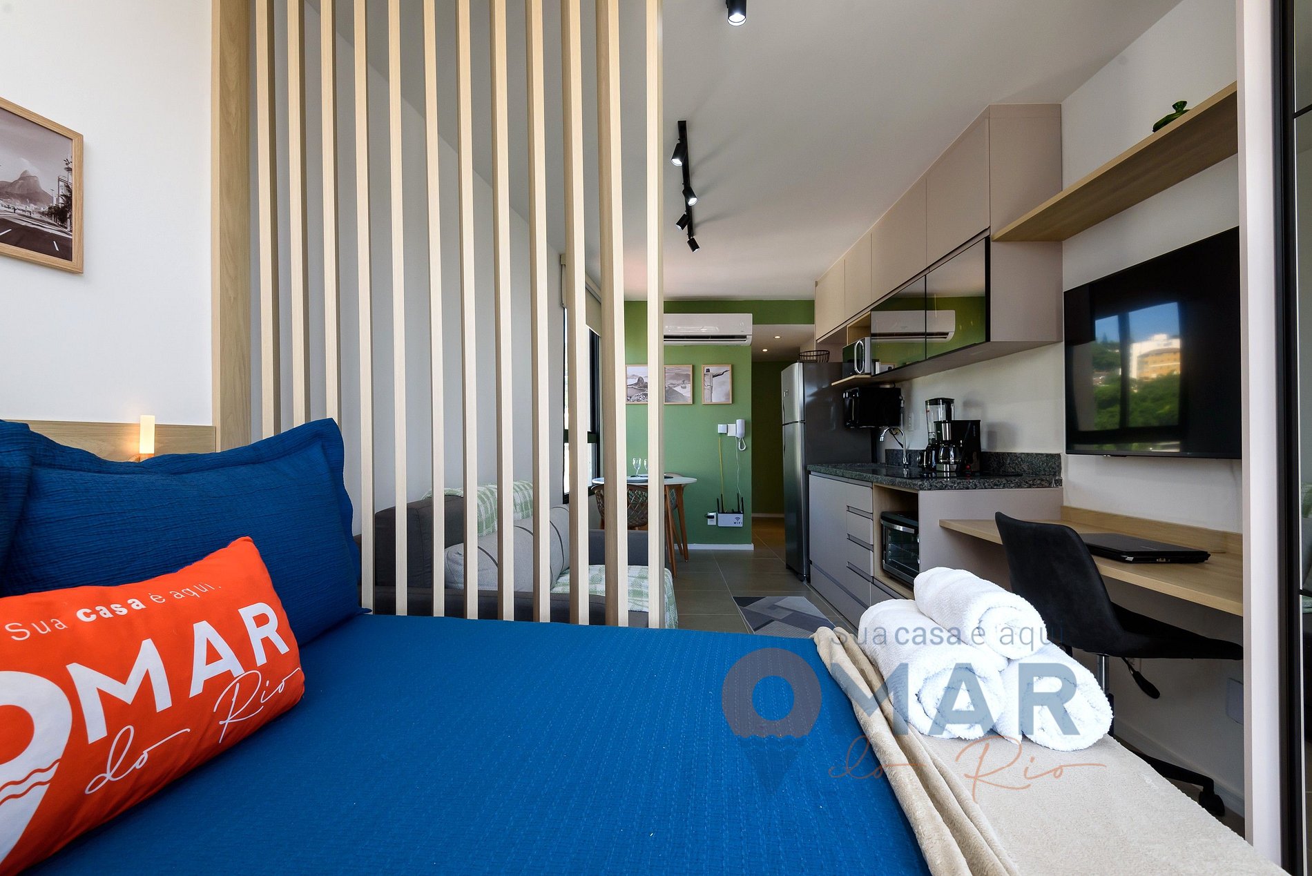 Estúdio: cama casal (188cm x 138cm), sofá - cama (188cm x 124cm), smart TV 50" com canais abertos (antena digital), ar-condicionado split, cortina blackout, armário com cabides, espaço de trabalho e mesa de jantar com assentos.