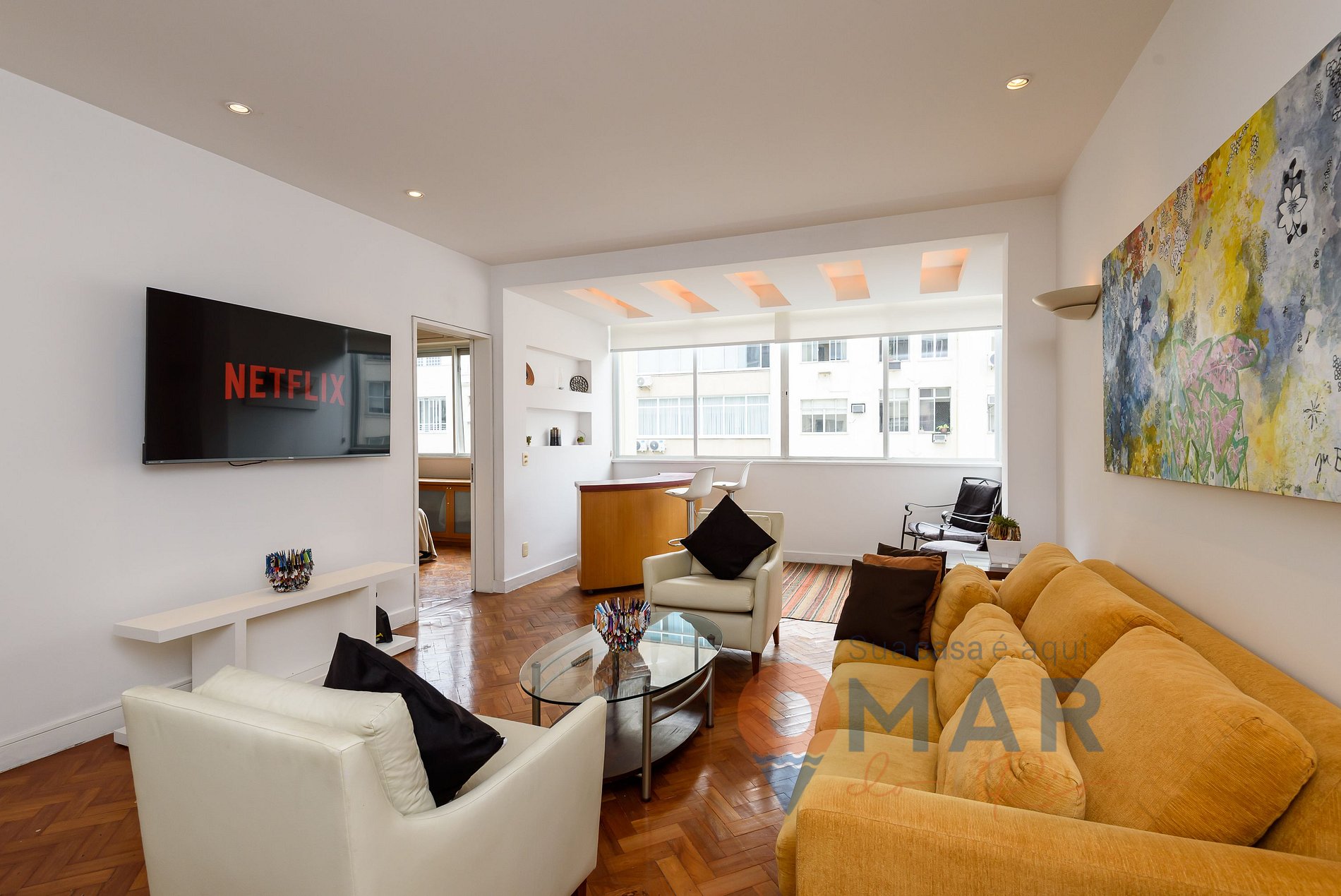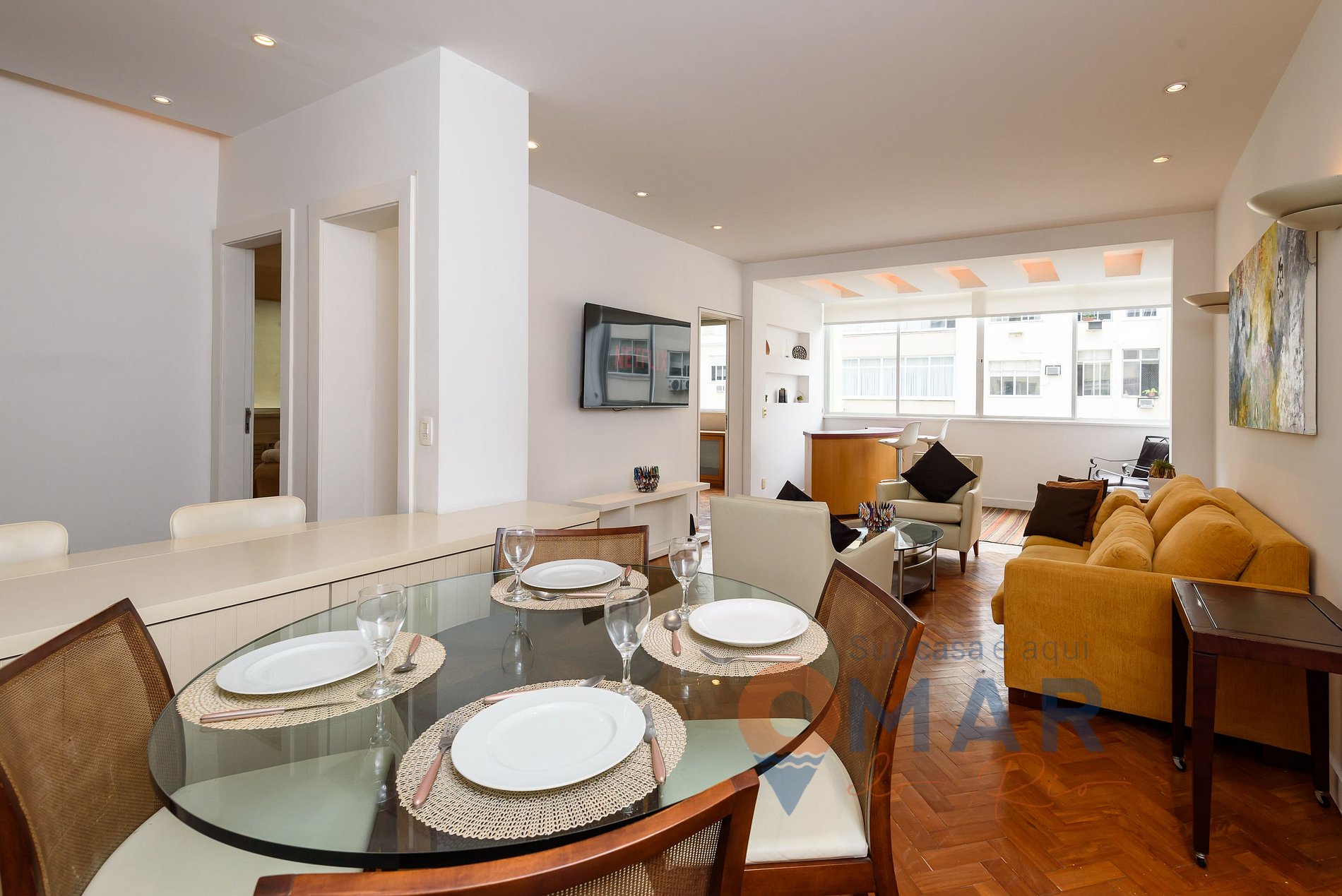 Sala: sofá, poltronas, smart TV 60" com canais abertos (antena digital), ar-condicionado split, persiana translúcida, bar com 2 banquetas, mesa de jantar com 4 cadeiras.