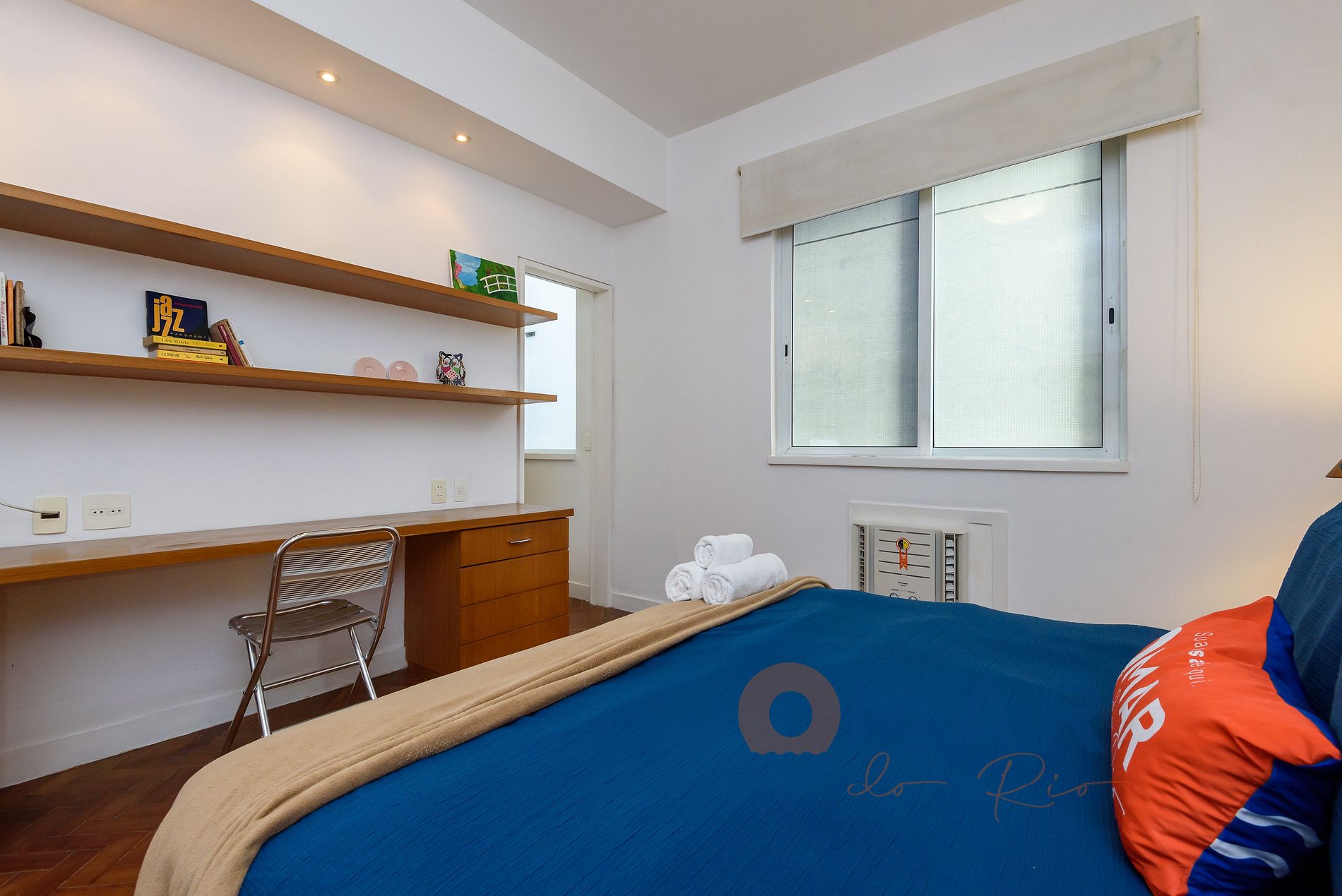 Quarto: cama casal (188cm x 138cm), ar-condicionado, guarda-roupas com cabides, espaço de trabalho e veneziana externa blackout.