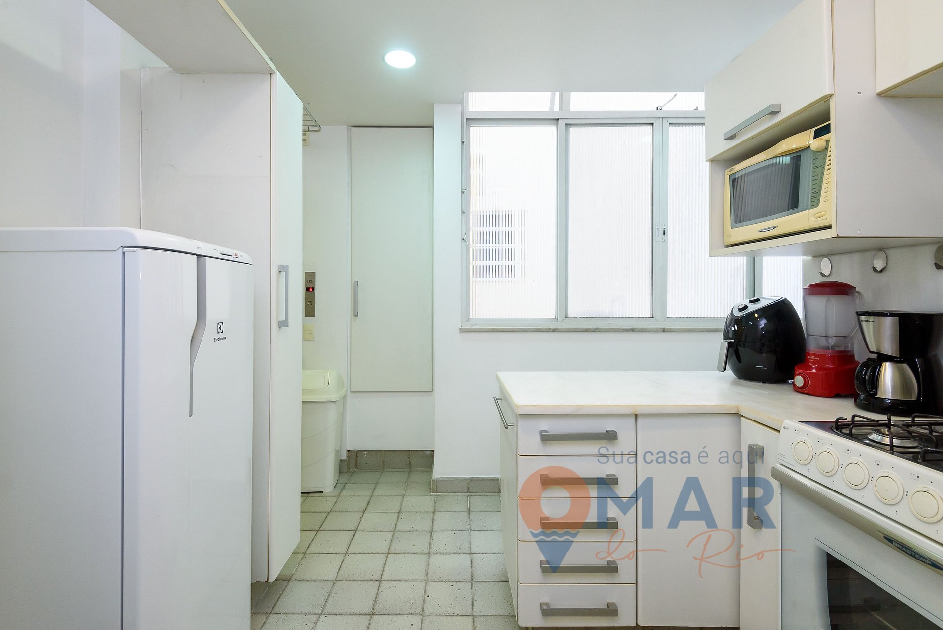 Cozinha: geladeira, fogão 6 bocas com forno, micro-ondas, air fryer, purificador de água com água natural e gelada, cafeteira elétrica, liquidificador, espremedor de frutas e utensílios para cozinhar.