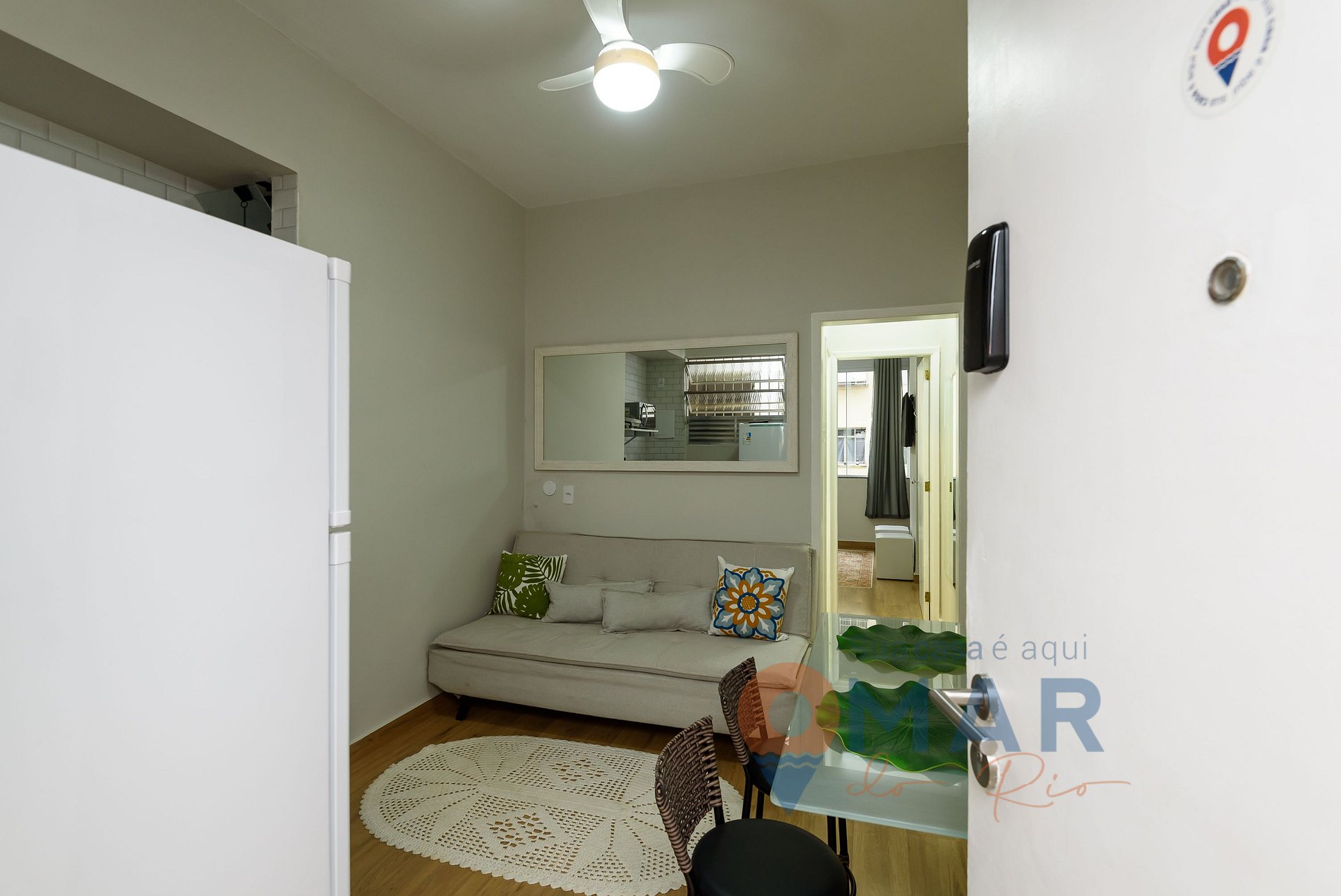 Sala: sofá-cama (42cm x 122cm x 209cm), ventilador, mesa de jantar com assentos e espelho.