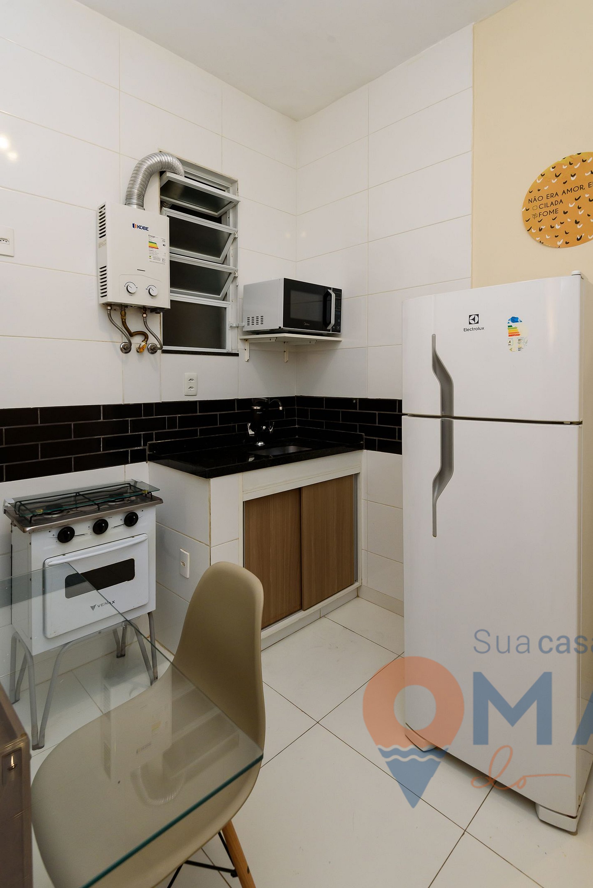 Cozinha: geladeira, fogão 2 bocas com forno compacto, micro-ondas, cafeteira, liquidificador, mesa de jantar com assentos e utensílios para cozinhar.